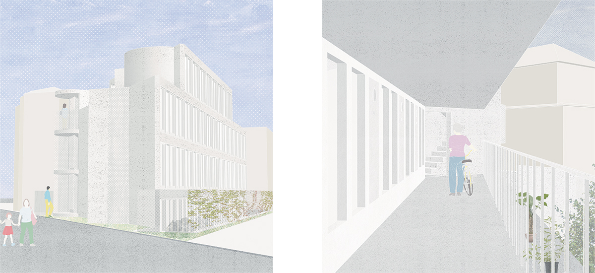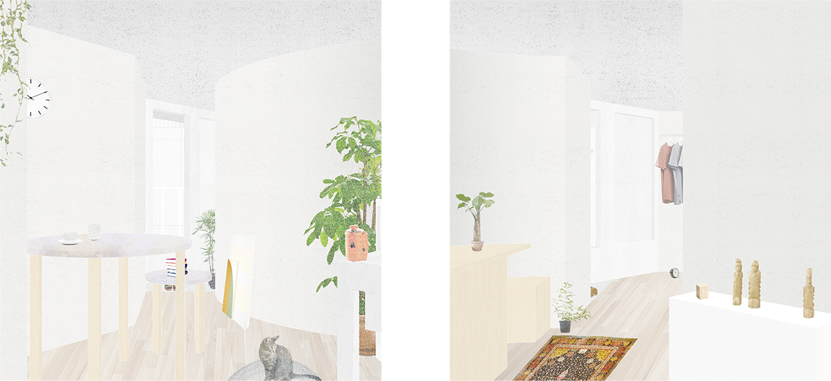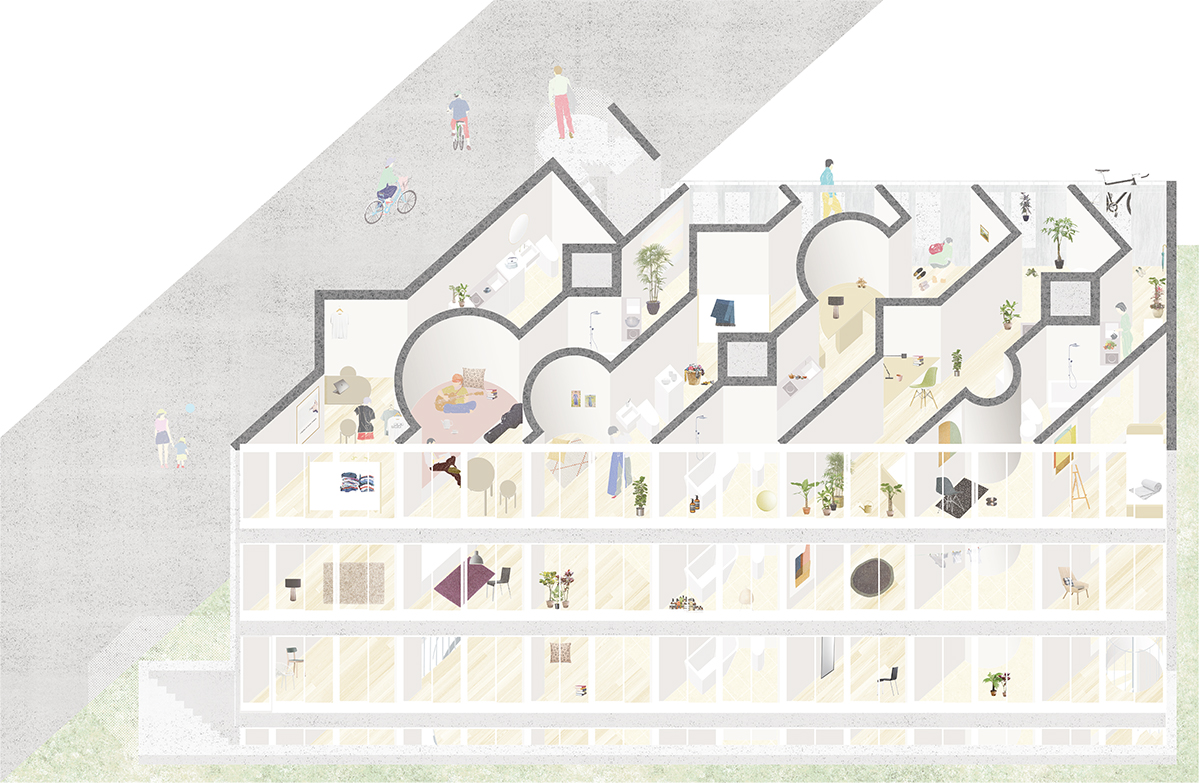 都心に建つ20戸の単身者向け集合住宅。台形敷地の斜線に面した道路と平行に戸境壁を挿入し、その壁を出っ込み引っ込みさせることで各所に溜まりをもった25m2の細長いワンルーム空間をつくる。住戸は、扉がひとつもない完全なワンルームとなっている。寝る、食べる、入浴する、排泄する、というそれぞれの行為が途切れることなく行われる生活は、単身者向け集合住宅の新しい形式となる。