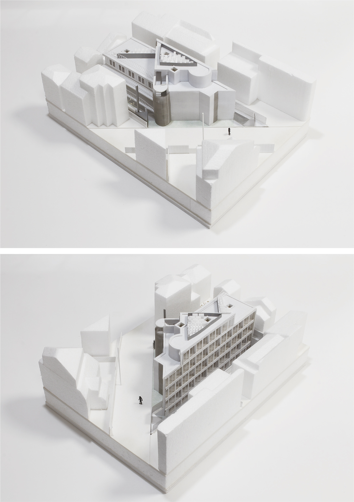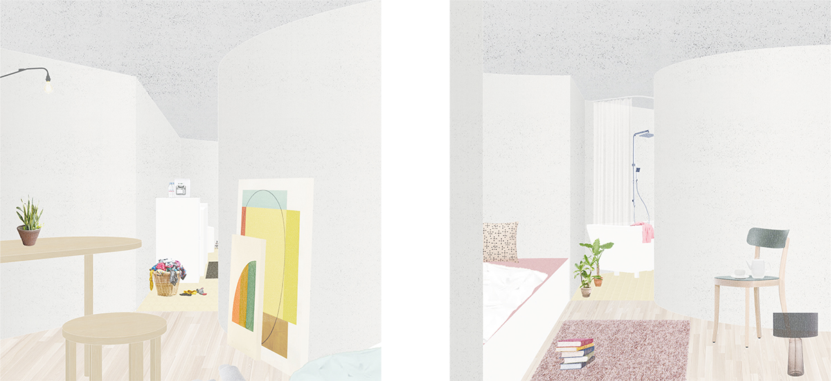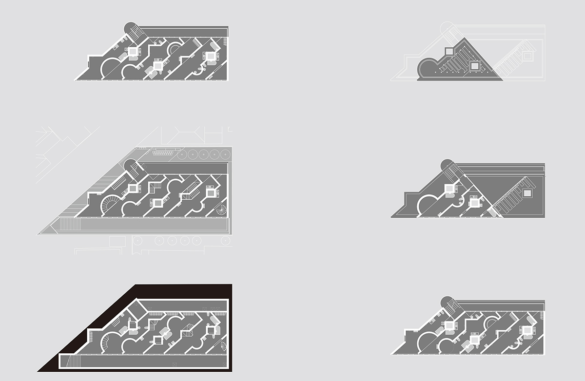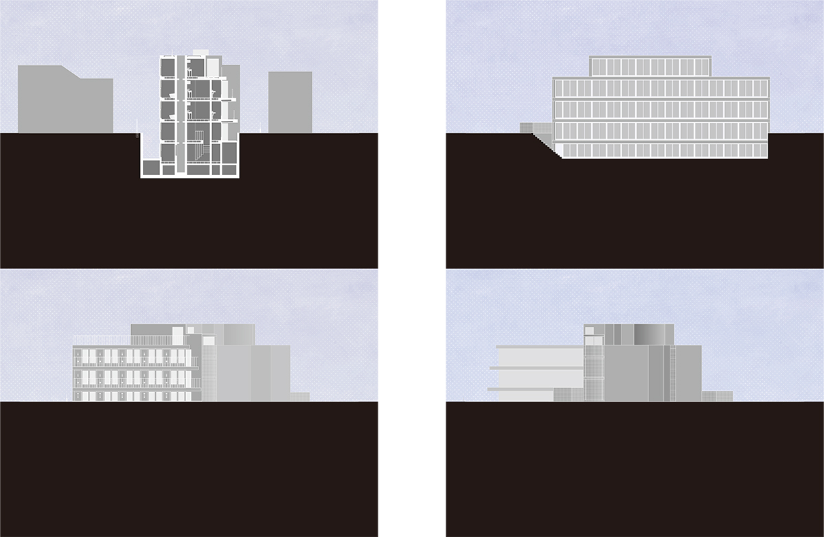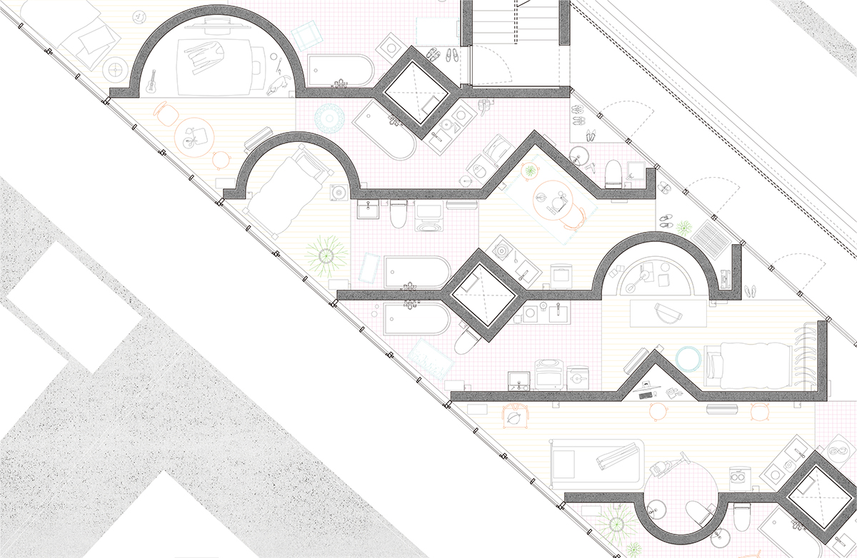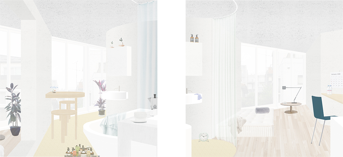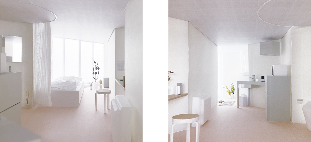 A 20-unit apartment for single people in the city center.Walls are inserted parallel to the road that cuts the site diagonally. And these walls are geometrically shaped to create a long and narrow 25m2 space with various niches.The dwelling unit  is a complete one-room space without any doors.《ONE ROOM APARTMENT》 is a new form of housing for single people, in which sleeping, eating, bathing, and excreting are performed without interruption.