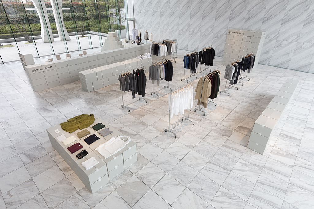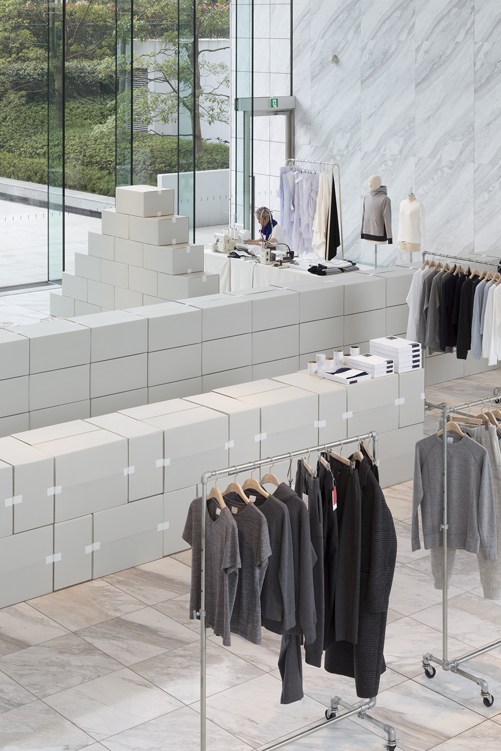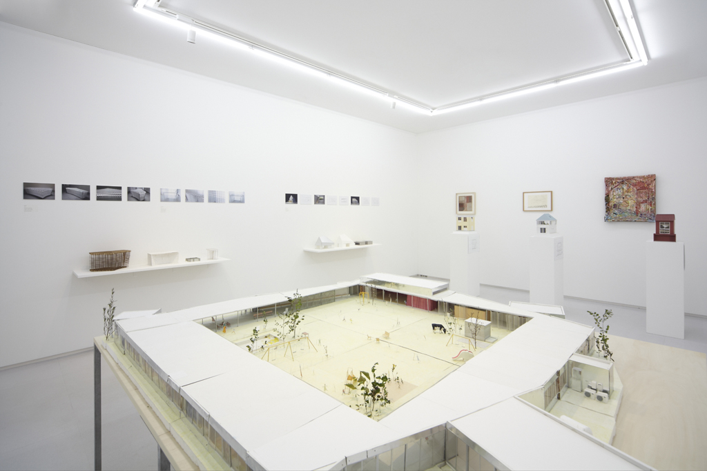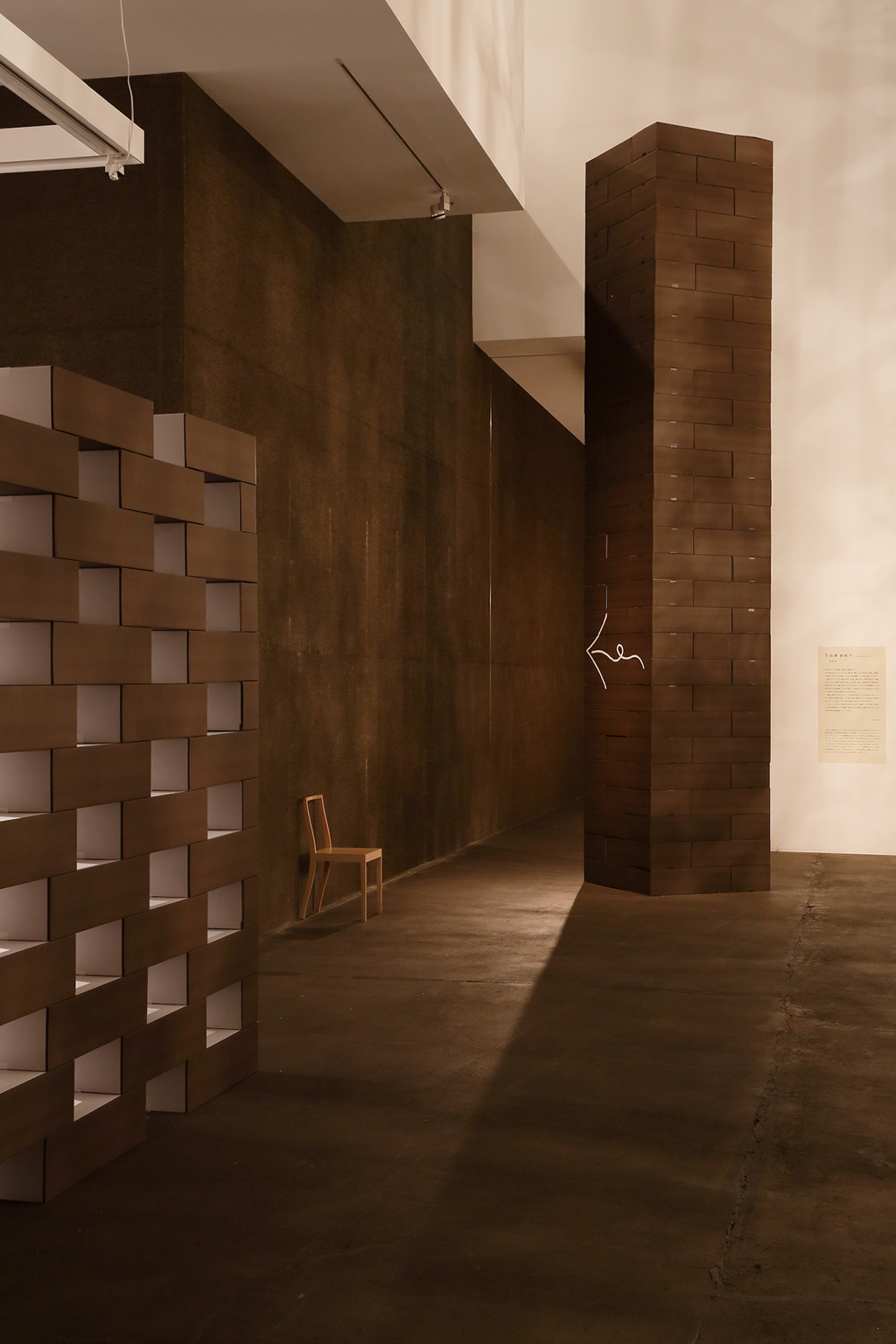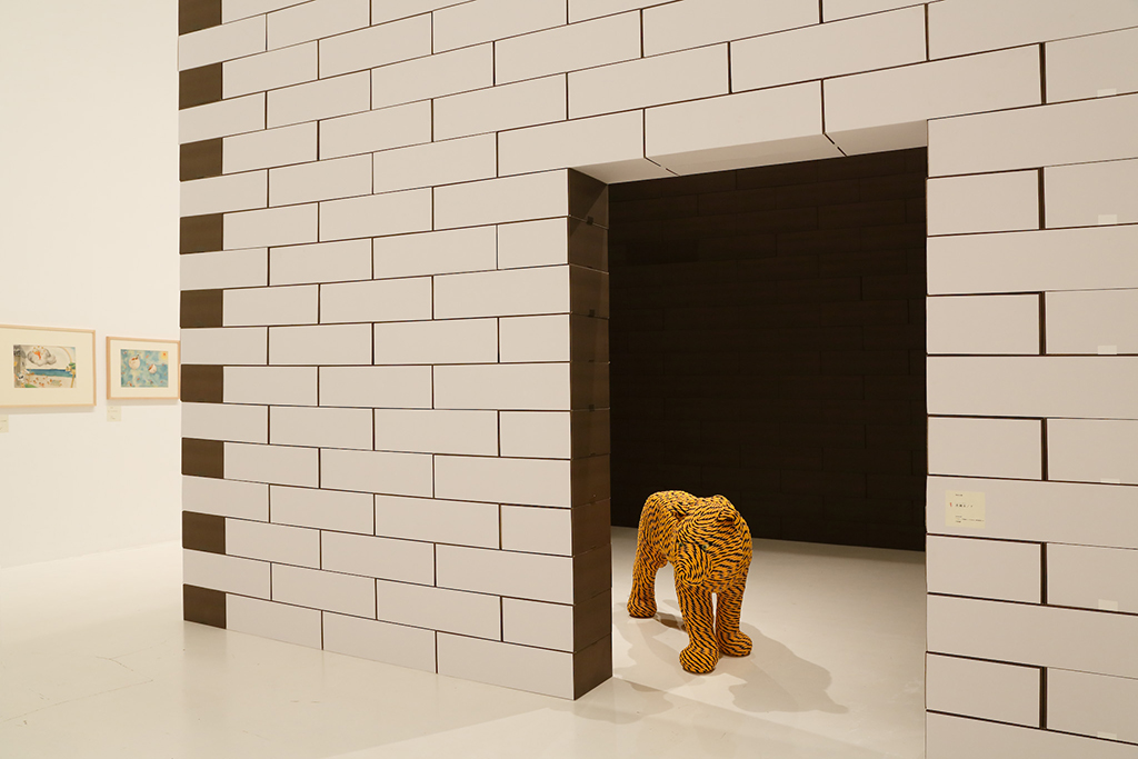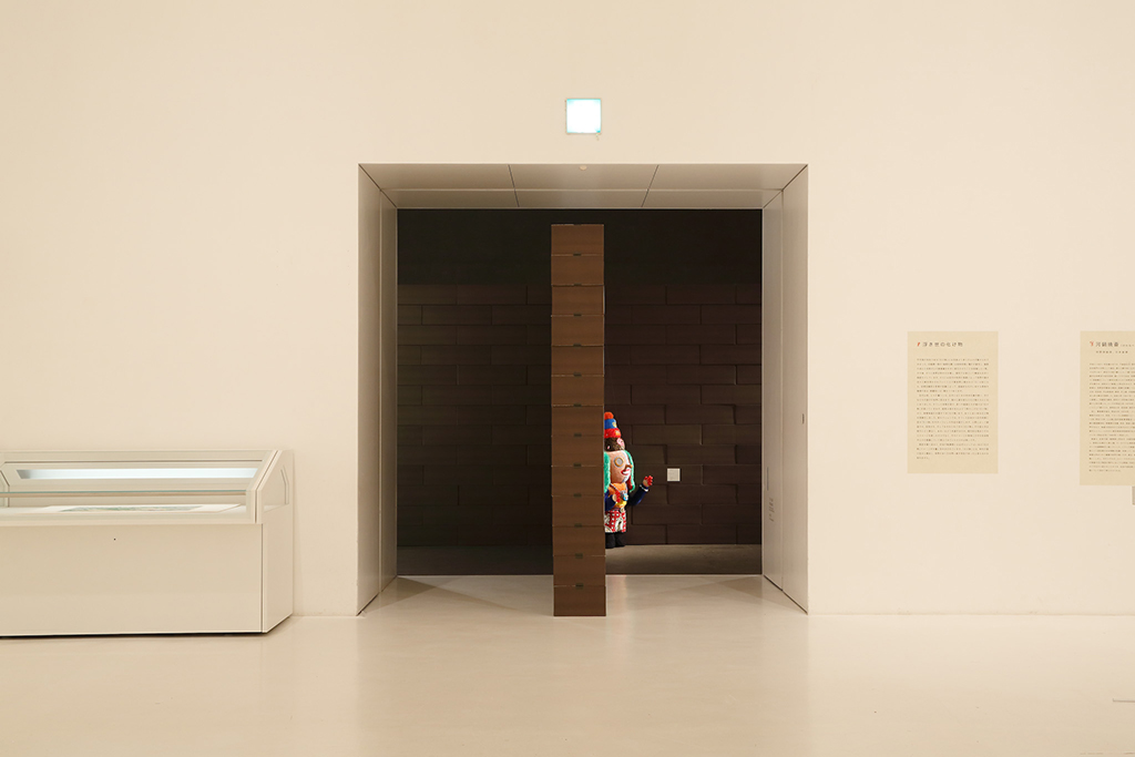 The exhibition space for Aomori Museum of Art exhibit “BAKEMONO,” loosely translated as goblins and spooks, was produced by stacking 1800 cardboard boxes that were mutated into giant bricks three times the size of the actual ones in the museum’s exterior wall. The cardboard bricks were painted white or brown on every three sides and laid in brickwork to serve as partitions walls, display tables and barriers. The rooms were set up so that the goblins and spooks of the collection would emerge from the dark one after another.