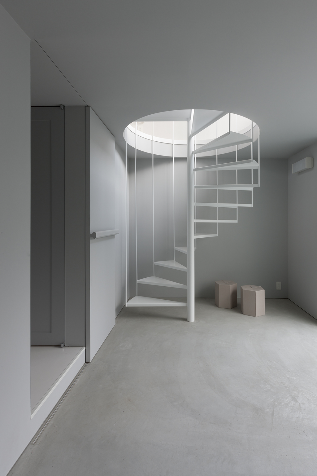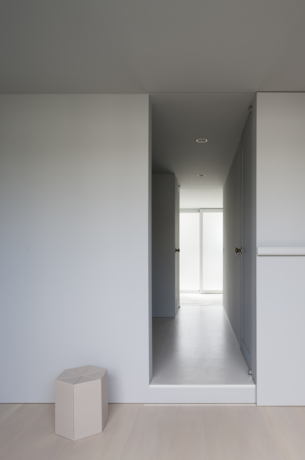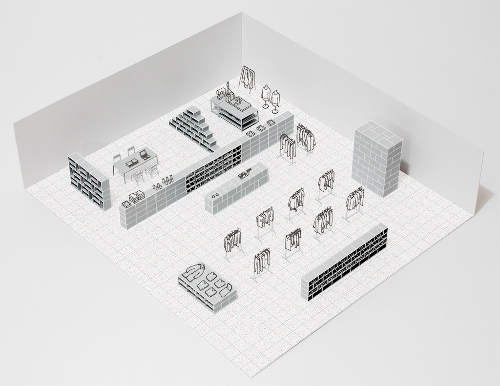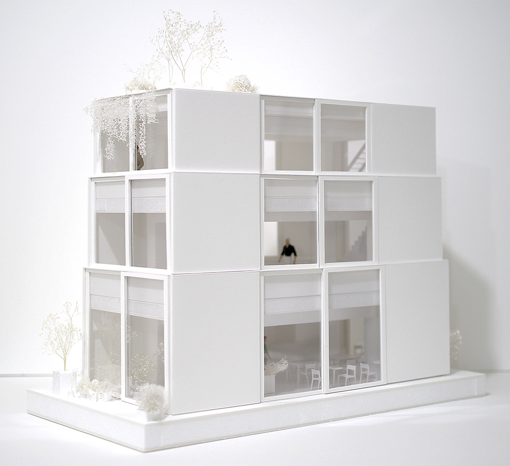 The exhibition space for Aomori Museum of Art exhibit “BAKEMONO,” loosely translated as goblins and spooks, was produced by stacking 1800 cardboard boxes that were mutated into giant bricks three times the size of the actual ones in the museum’s exterior wall. The cardboard bricks were painted white or brown on every three sides and laid in brickwork to serve as partitions walls, display tables and barriers. The rooms were set up so that the goblins and spooks of the collection would emerge from the dark one after another.