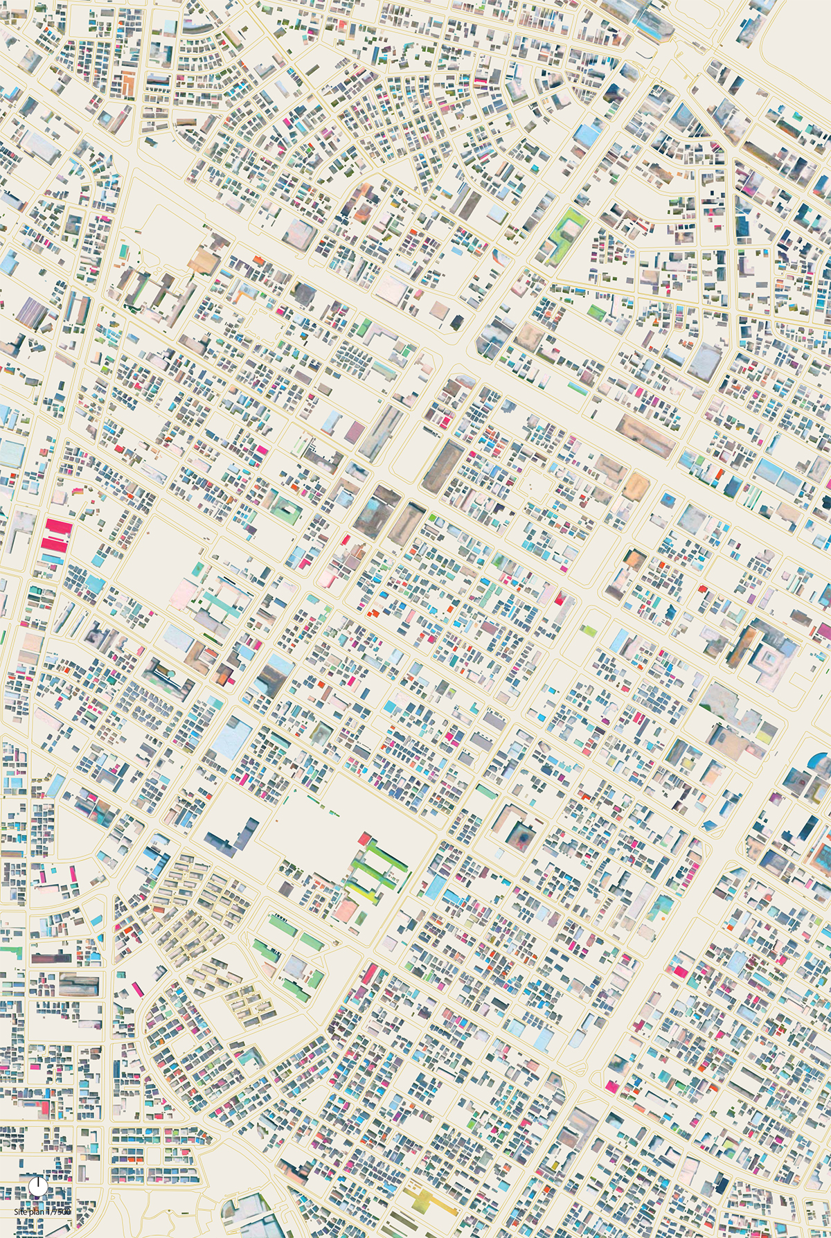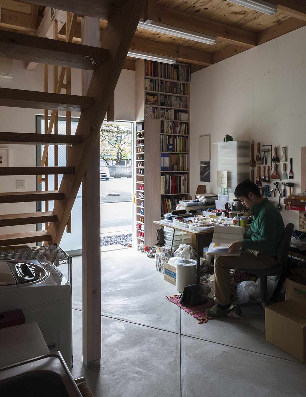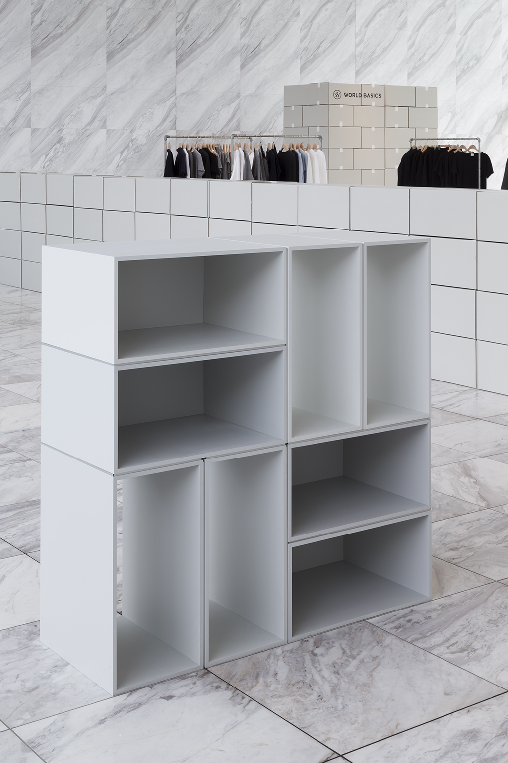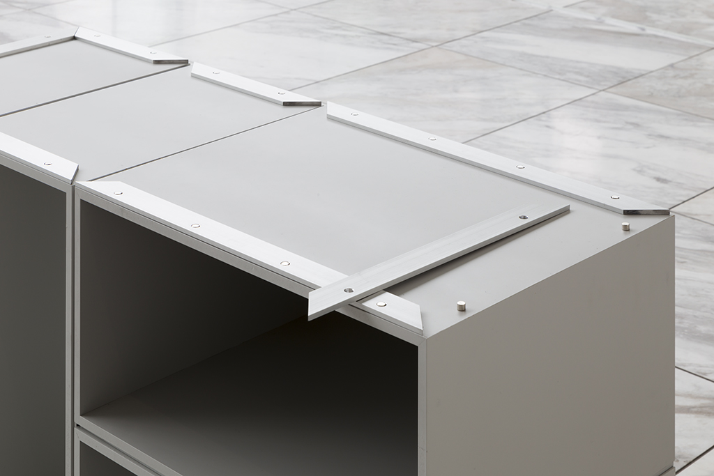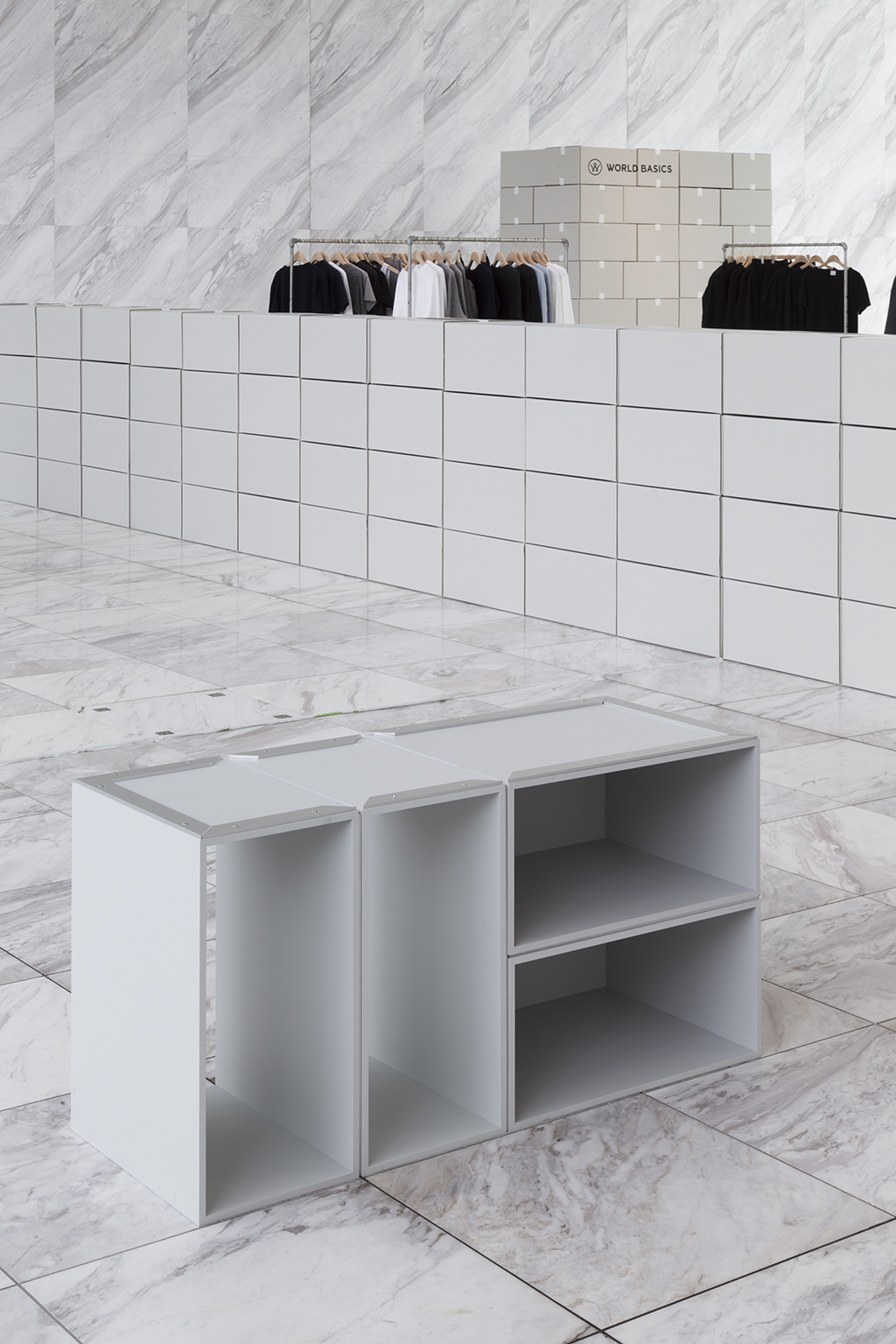 The exhibition space for Aomori Museum of Art exhibit “BAKEMONO,” loosely translated as goblins and spooks, was produced by stacking 1800 cardboard boxes that were mutated into giant bricks three times the size of the actual ones in the museum’s exterior wall. The cardboard bricks were painted white or brown on every three sides and laid in brickwork to serve as partitions walls, display tables and barriers. The rooms were set up so that the goblins and spooks of the collection would emerge from the dark one after another.
