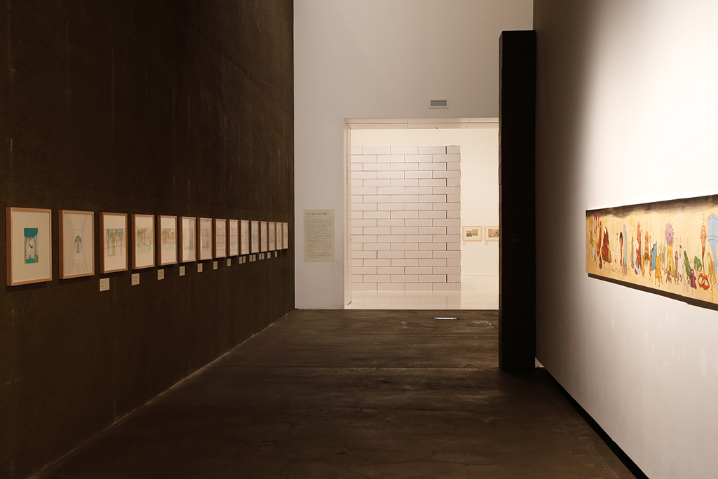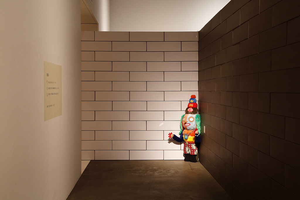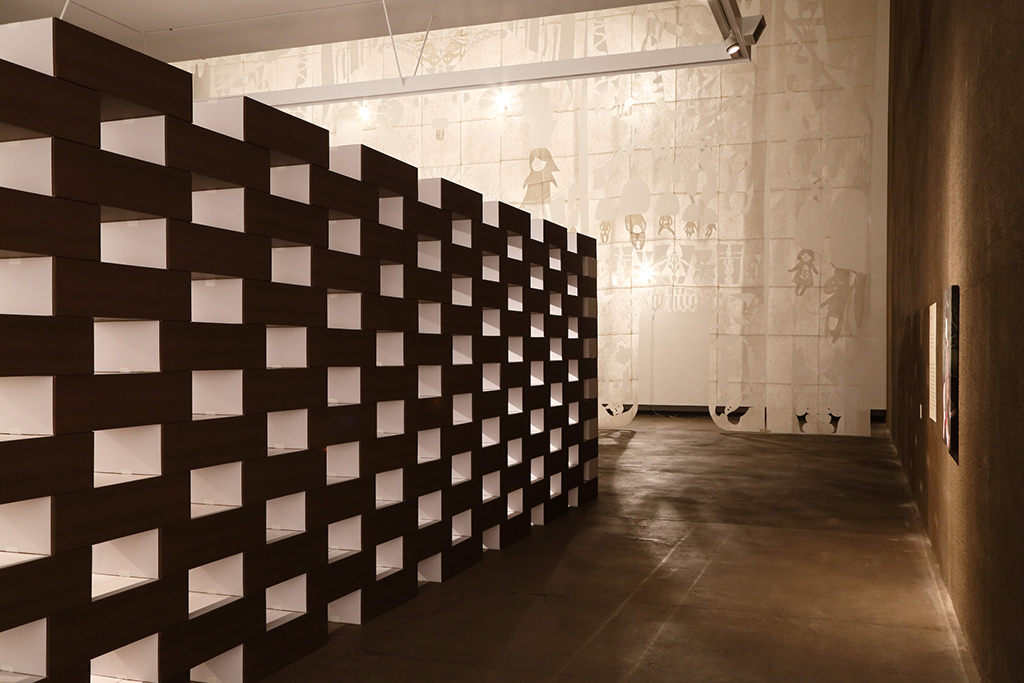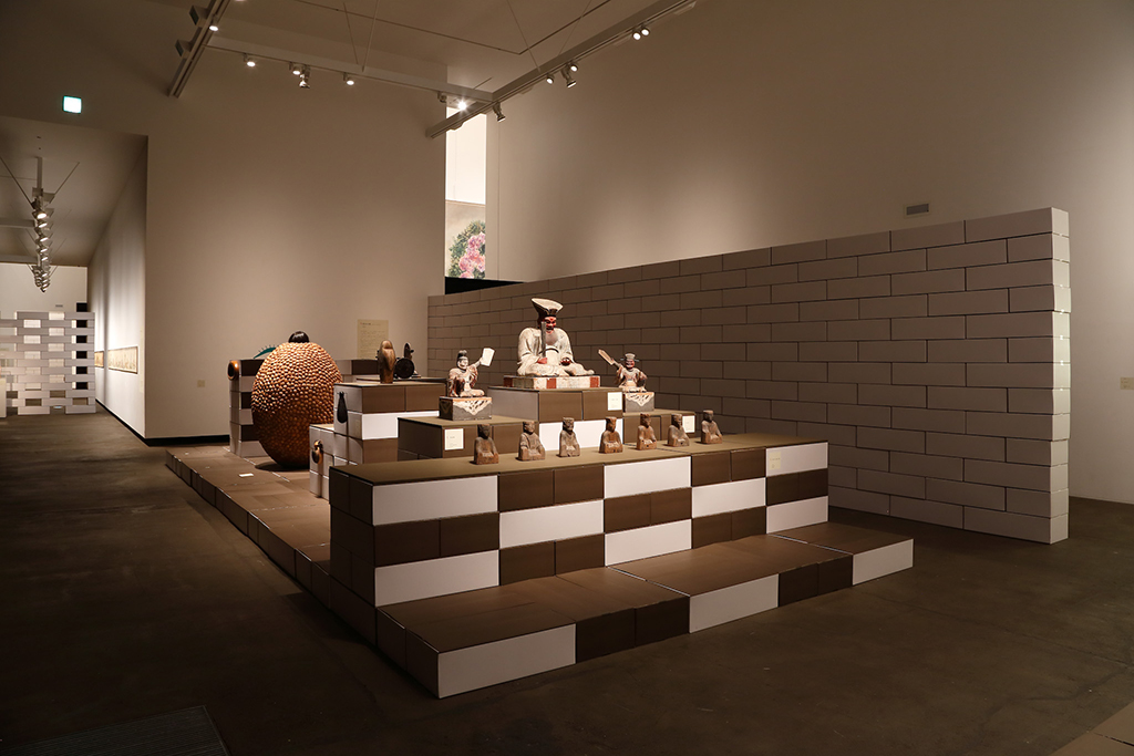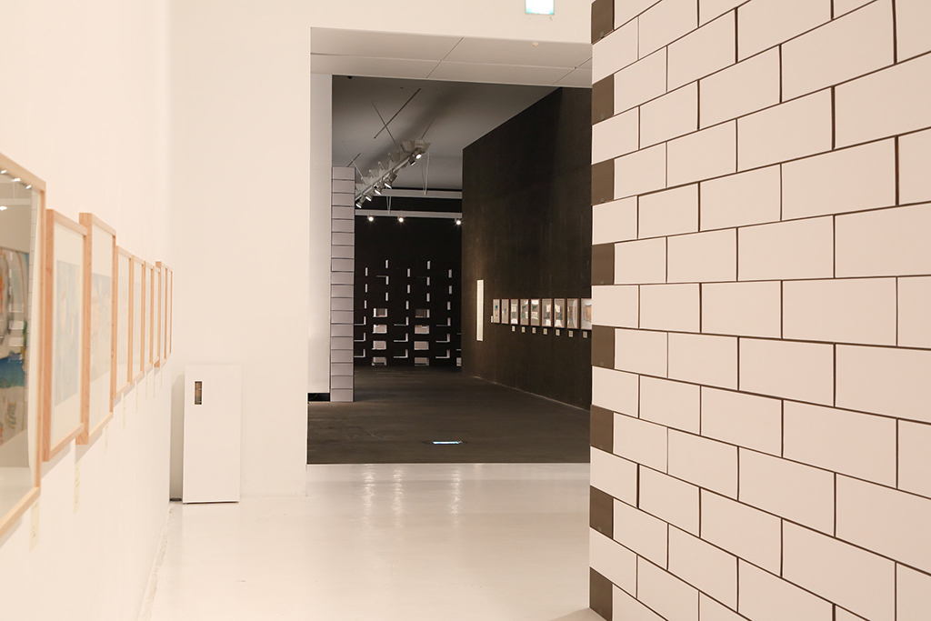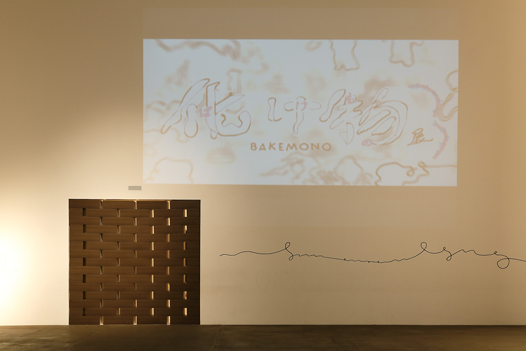 青森県立美術館で開催された『化け物展』の会場構成デザインである。青森県立美術館は、レンガを積んで白く塗った外壁、白と茶が目まぐるしく展開する展示室をもつ美術館である。手がかりとしたのは、青森県美を「化かす」こと。外壁に使用しているレンガを3倍の大きさのダンボールに化かし、それらをさまざまに組み上げることで間仕切り壁や展示台、結界などをつくっている。さらに、白と茶というハイコントラストな展示室に呼応し、かつその特徴を増幅するように、ダンボールレンガを白と茶で3面ずつ塗り分けをした。お化け屋敷の空間をイメージして、一筆書きの動線と作家ごとに小分けにした空間の連続により化け物(作品)が突如現れるかのような構成としている。