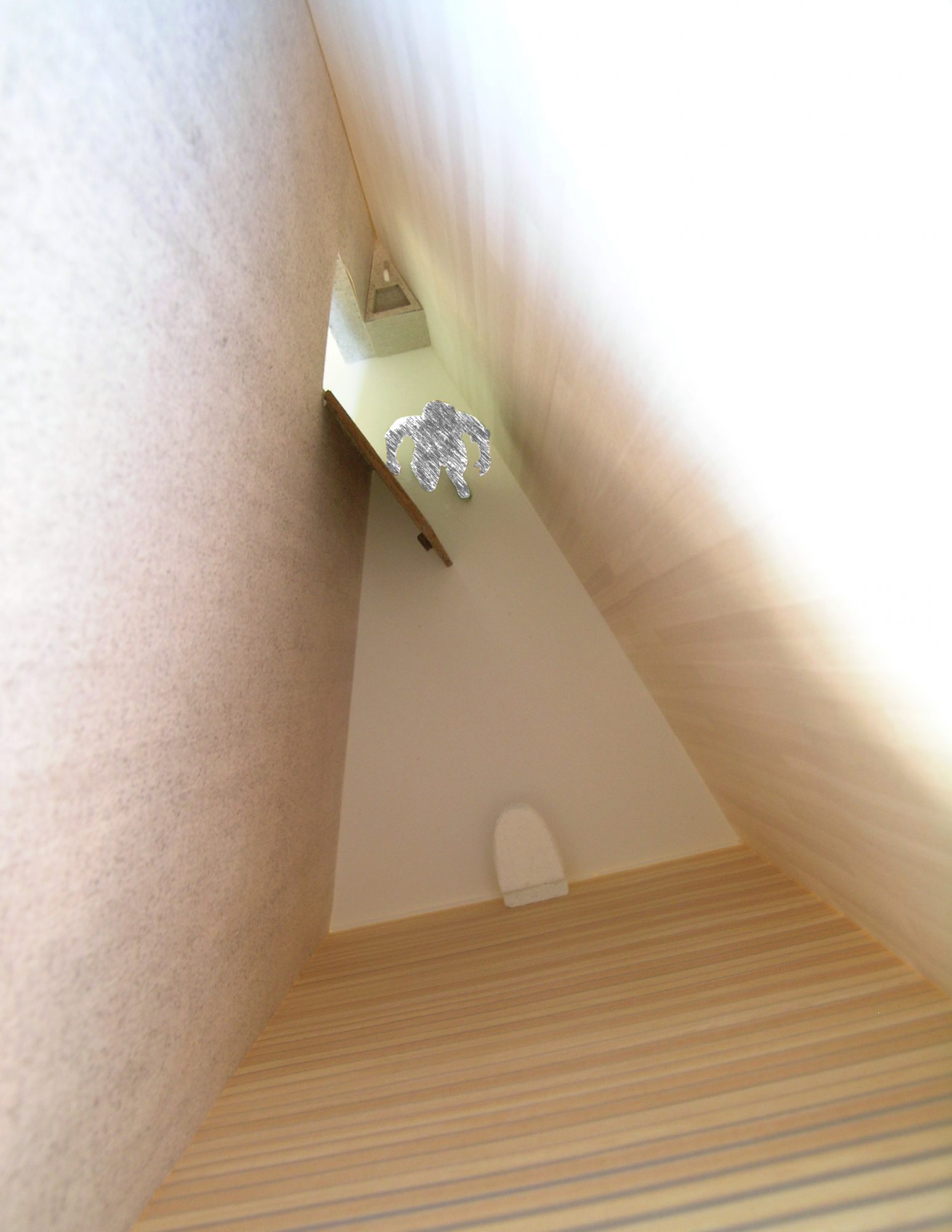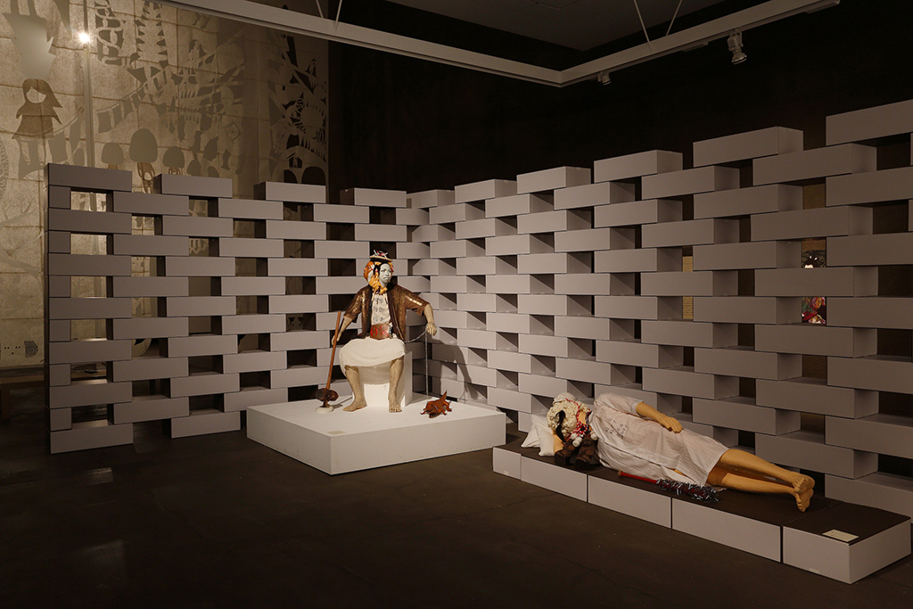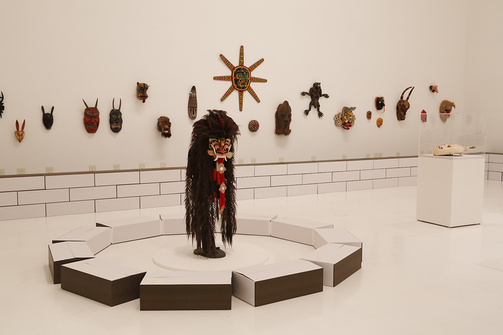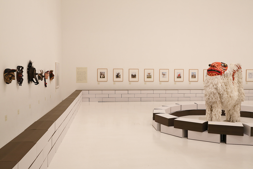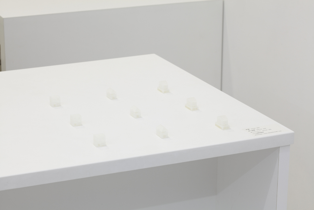 青森県立美術館で開催された『化け物展』の会場構成デザインである。青森県立美術館は、レンガを積んで白く塗った外壁、白と茶が目まぐるしく展開する展示室をもつ美術館である。手がかりとしたのは、青森県美を「化かす」こと。外壁に使用しているレンガを3倍の大きさのダンボールに化かし、それらをさまざまに組み上げることで間仕切り壁や展示台、結界などをつくっている。さらに、白と茶というハイコントラストな展示室に呼応し、かつその特徴を増幅するように、ダンボールレンガを白と茶で3面ずつ塗り分けをした。お化け屋敷の空間をイメージして、一筆書きの動線と作家ごとに小分けにした空間の連続により化け物(作品)が突如現れるかのような構成としている。