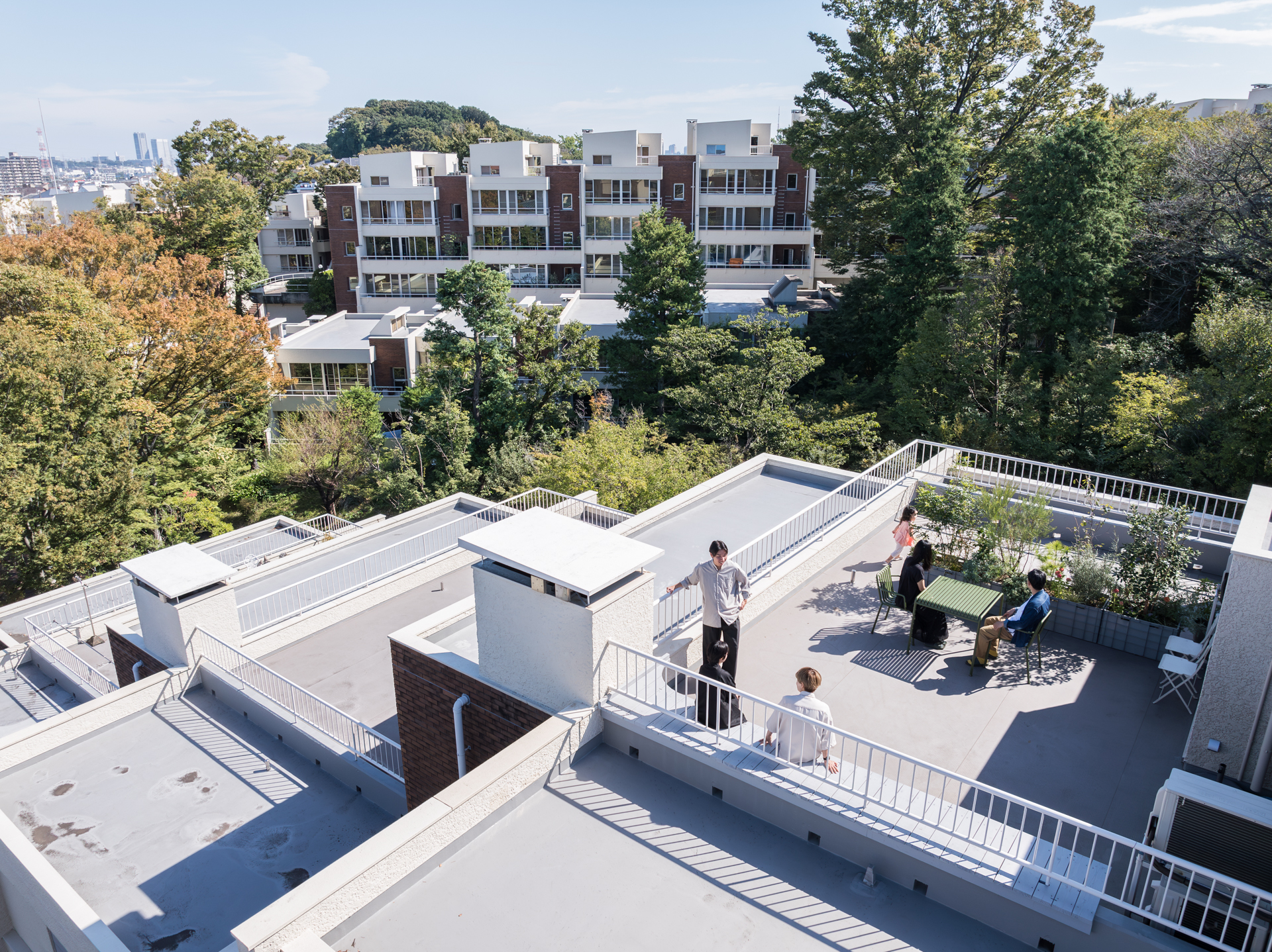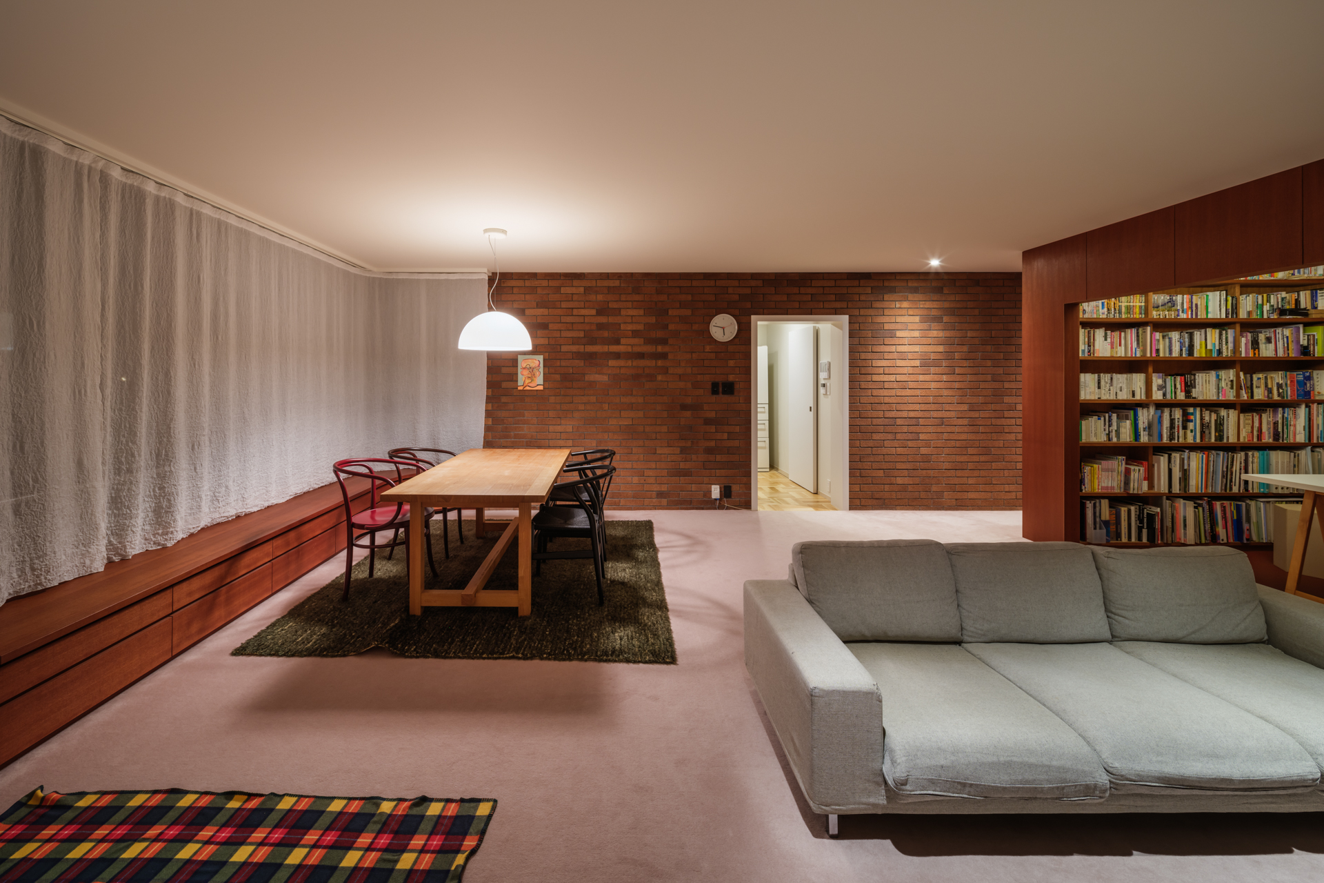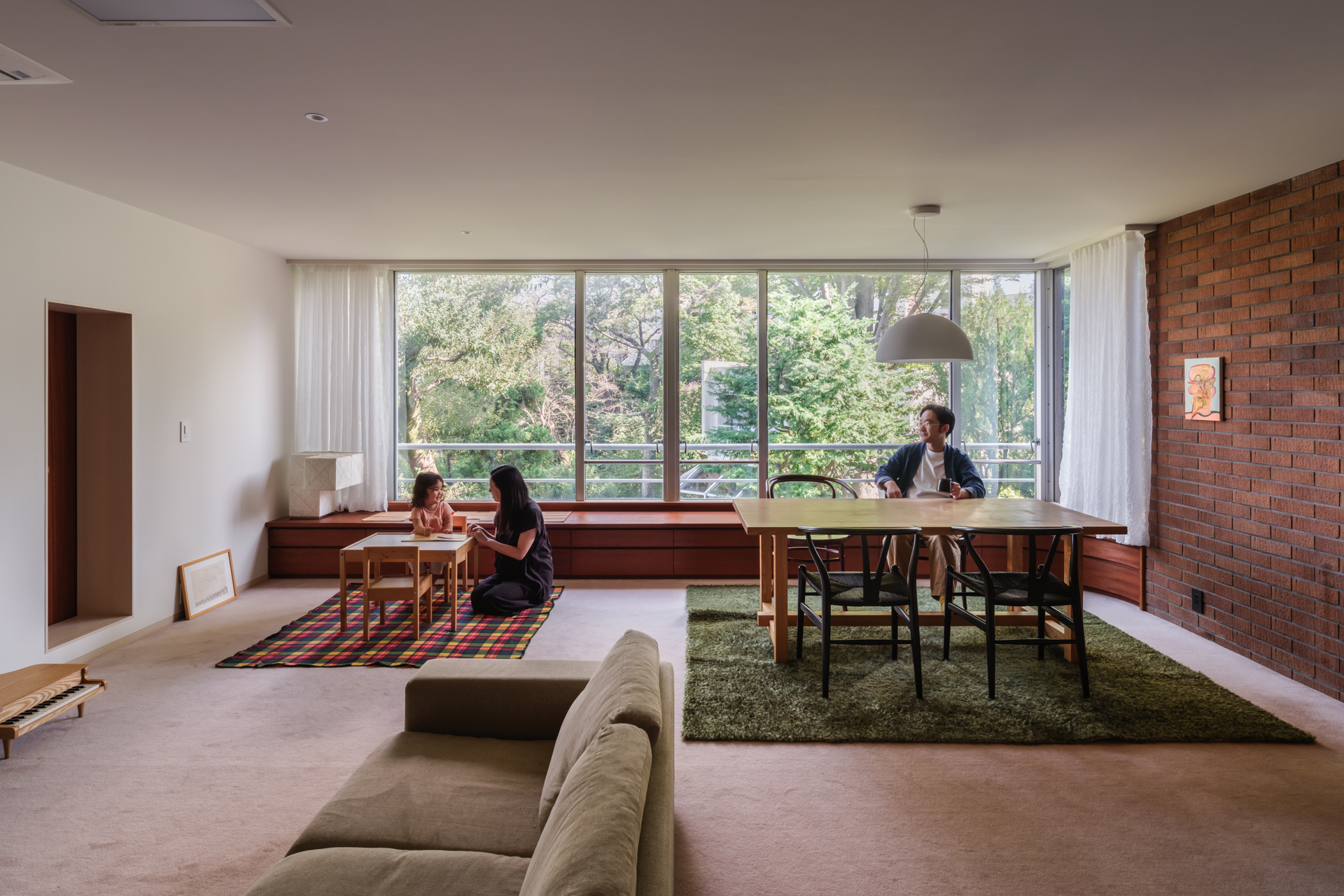 この集合住宅は 50 年前にこの地に建った。自然の起伏に富んだ地形を活かして 10 の低層住棟を配置し、中心には 800 坪の自然緑地を有する素晴らしい環境が残っている。本計画は、この価値のある環境を住み継ぐこと、そして、残し続けることを目標とした設計者の自邸である。緑が繁茂した圧倒的な自然緑地に対峙するために、世界各地で見られる「人間にとって居心地のいい広さ」と吉村順三が言及している九間のリビングを、さらにテラスにも同じ大きさのアウトルームを設けた。この2つの九間を中心に住戸全体をふたつのゾーンに分け、前者には家族の居住スペース、後者にはミニキッチンとトイレを増設し、二世帯居住や職住一体といったライフスタイルの変化に対応できるようにした。仕上げは、竣工時の図面や文献から当時の素材を、現在の建物の外装、外構から実際に使われている材料の色や質感を丁寧に調べ、元の建築をオーバーホールするかのように復元や更新を行った。可能な限り住み手の趣味嗜好を排除しつつニュートラルで建築の魅力を最大化したデザインにすることで、仮に住み手である私たちがいなくなっても、誰もが住める、住み継げる住宅をめざした。