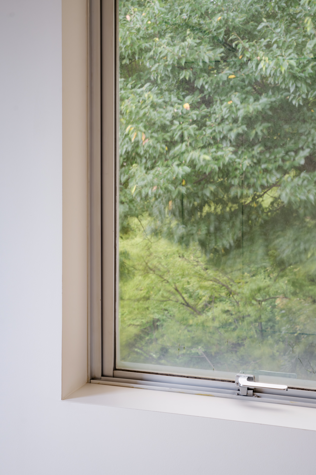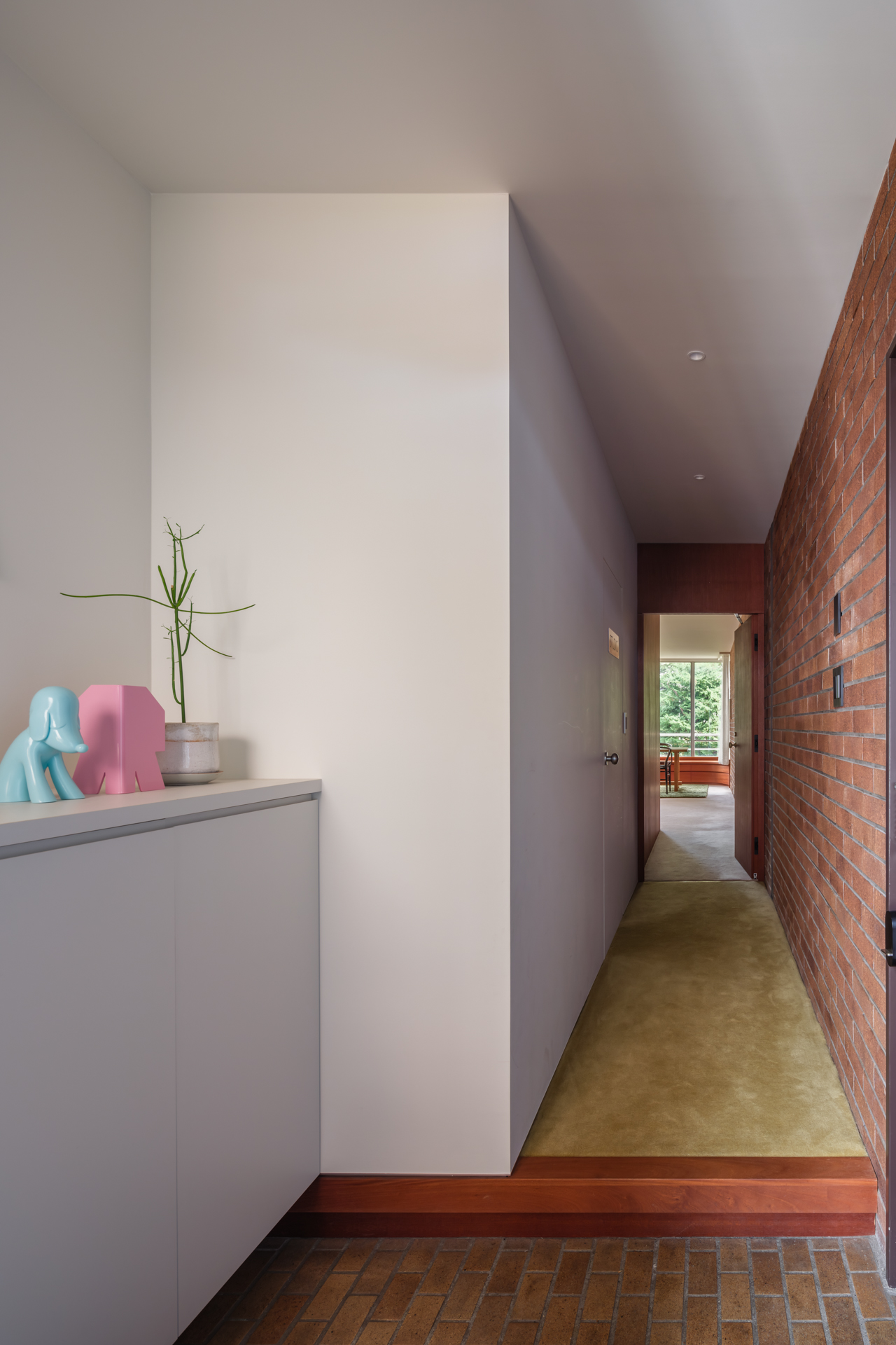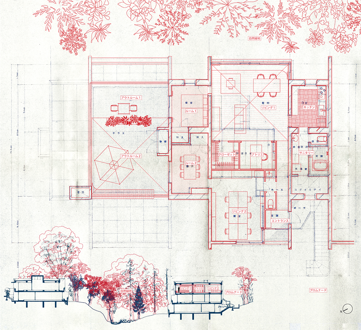 この集合住宅は 50 年前にこの地に建った。自然の起伏に富んだ地形を活かして 10 の低層住棟を配置し、中心には 800 坪の自然緑地を有する素晴らしい環境が残っている。本計画は、この価値のある環境を住み継ぐこと、そして、残し続けることを目標とした設計者の自邸である。緑が繁茂した圧倒的な自然緑地に対峙するために、世界各地で見られる「人間にとって居心地のいい広さ」と吉村順三が言及している九間のリビングを、さらにテラスにも同じ大きさのアウトルームを設けた。この2つの九間を中心に住戸全体をふたつのゾーンに分け、前者には家族の居住スペース、後者にはミニキッチンとトイレを増設し、二世帯居住や職住一体といったライフスタイルの変化に対応できるようにした。仕上げは、竣工時の図面や文献から当時の素材を、現在の建物の外装、外構から実際に使われている材料の色や質感を丁寧に調べ、元の建築をオーバーホールするかのように復元や更新を行った。可能な限り住み手の趣味嗜好を排除しつつニュートラルで建築の魅力を最大化したデザインにすることで、仮に住み手である私たちがいなくなっても、誰もが住める、住み継げる住宅をめざした。