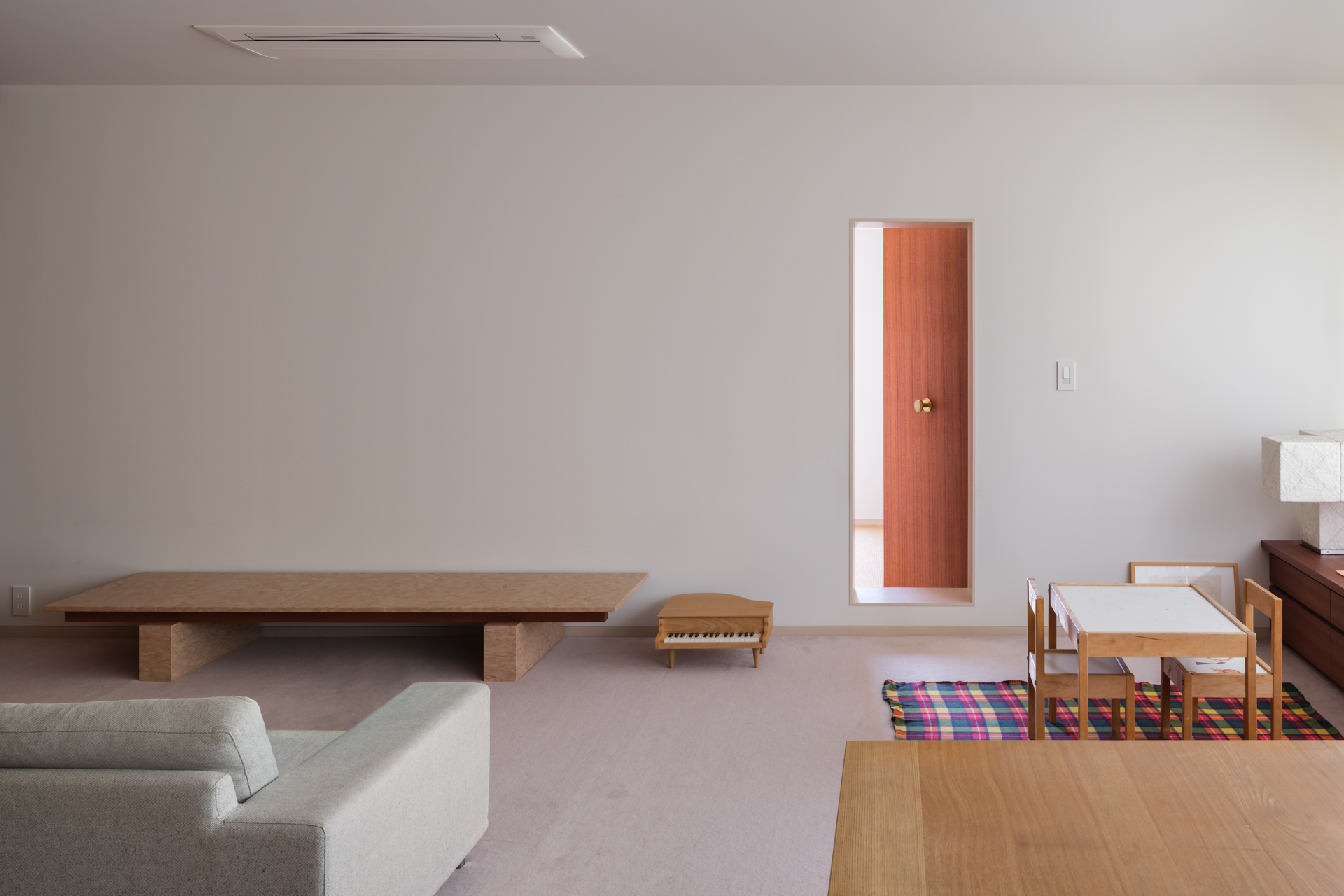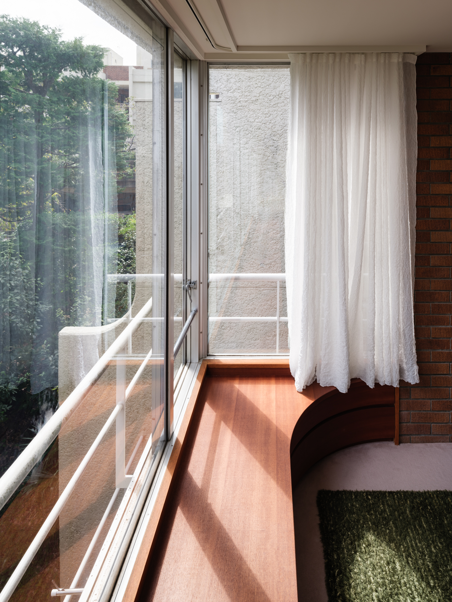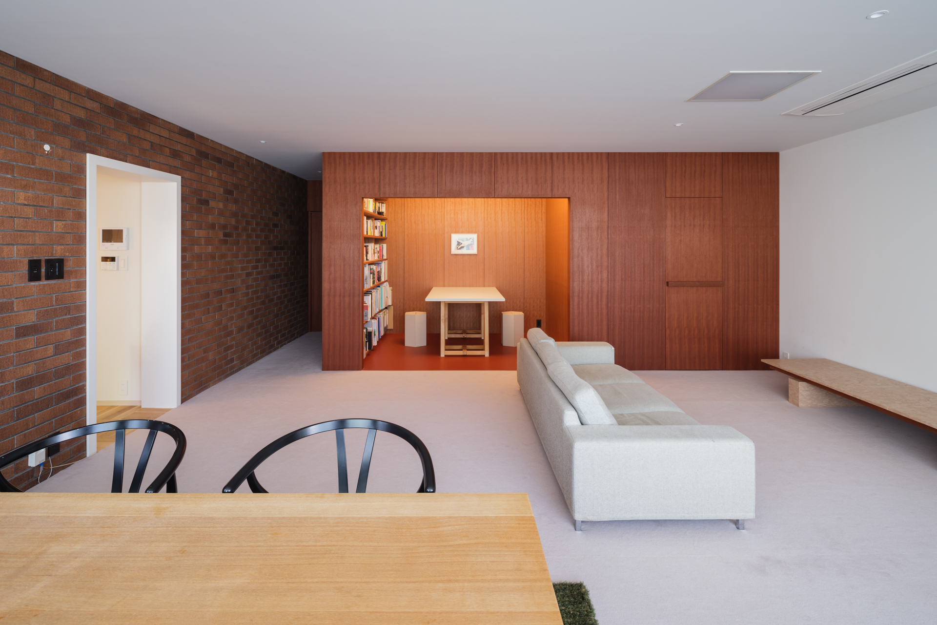 This housing complex, built 50 years ago, takes advantage of natural undulations and preserves a rare 800-tsubo (approx. 1,000 m2) green spaceat its center. The project is the designersʼ own residence, intended to passthis environment to future generations. Facing the overwhelming greenery,the living room was designed in Junzo Yoshimuraʼs “ Kokonoma ” scale̶ which he noted as “ a comfortable size for humans ” found around the world. Another terrace of the same size was placed outside. Together they form the core, dividing the house into two zones: a family living area and a multipurpose zone with a mini-kitchen and toilet. Materials and colors were carefully researched from the original completion period and the existing building, enabling a restoration and renewal similar to overhauling the original architecture. By designing a neutral space that maximizes architectural appeal while minimizing the infl uence of the our personal tastes, we aimed to design a residence that can be lived in by anyone over time.