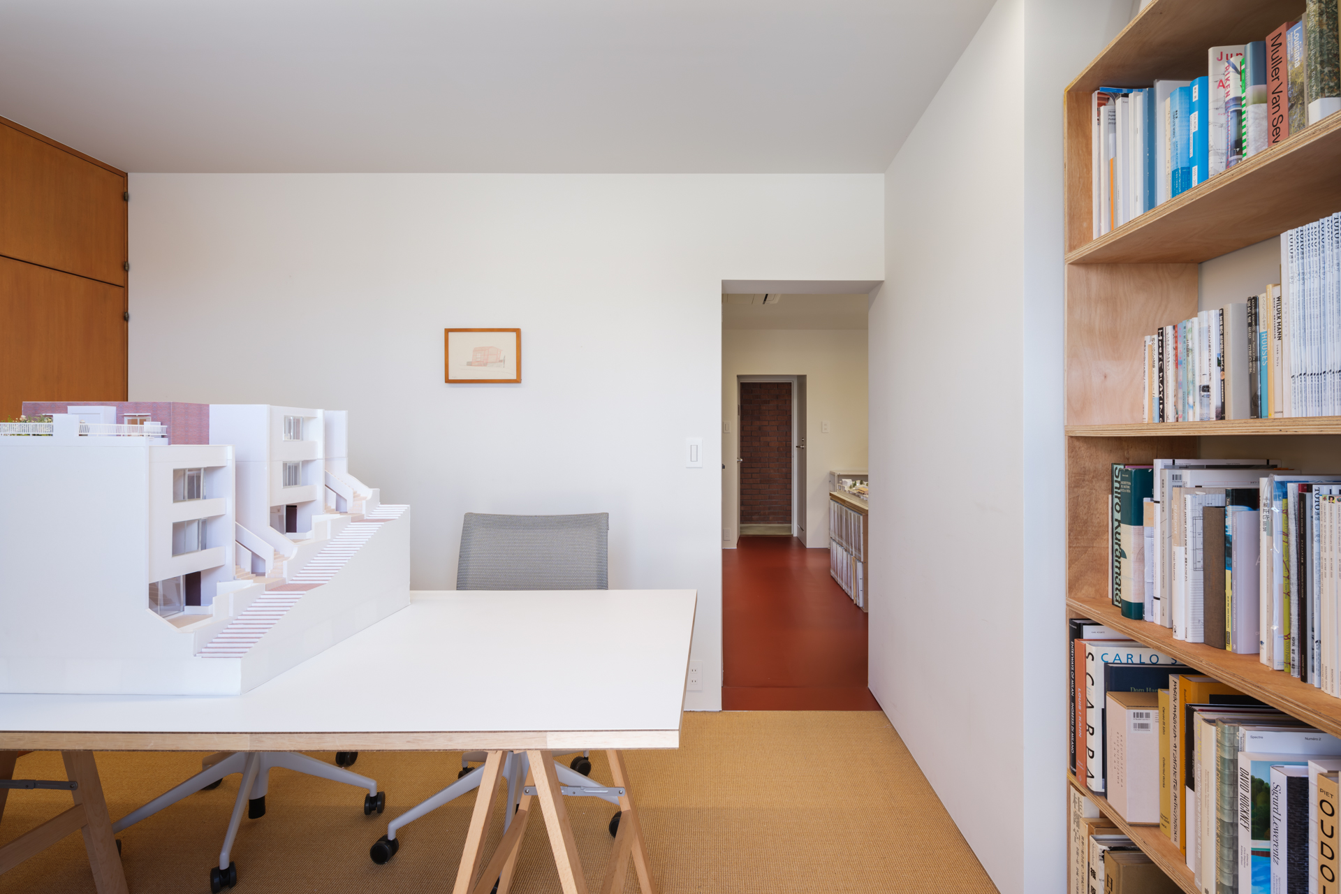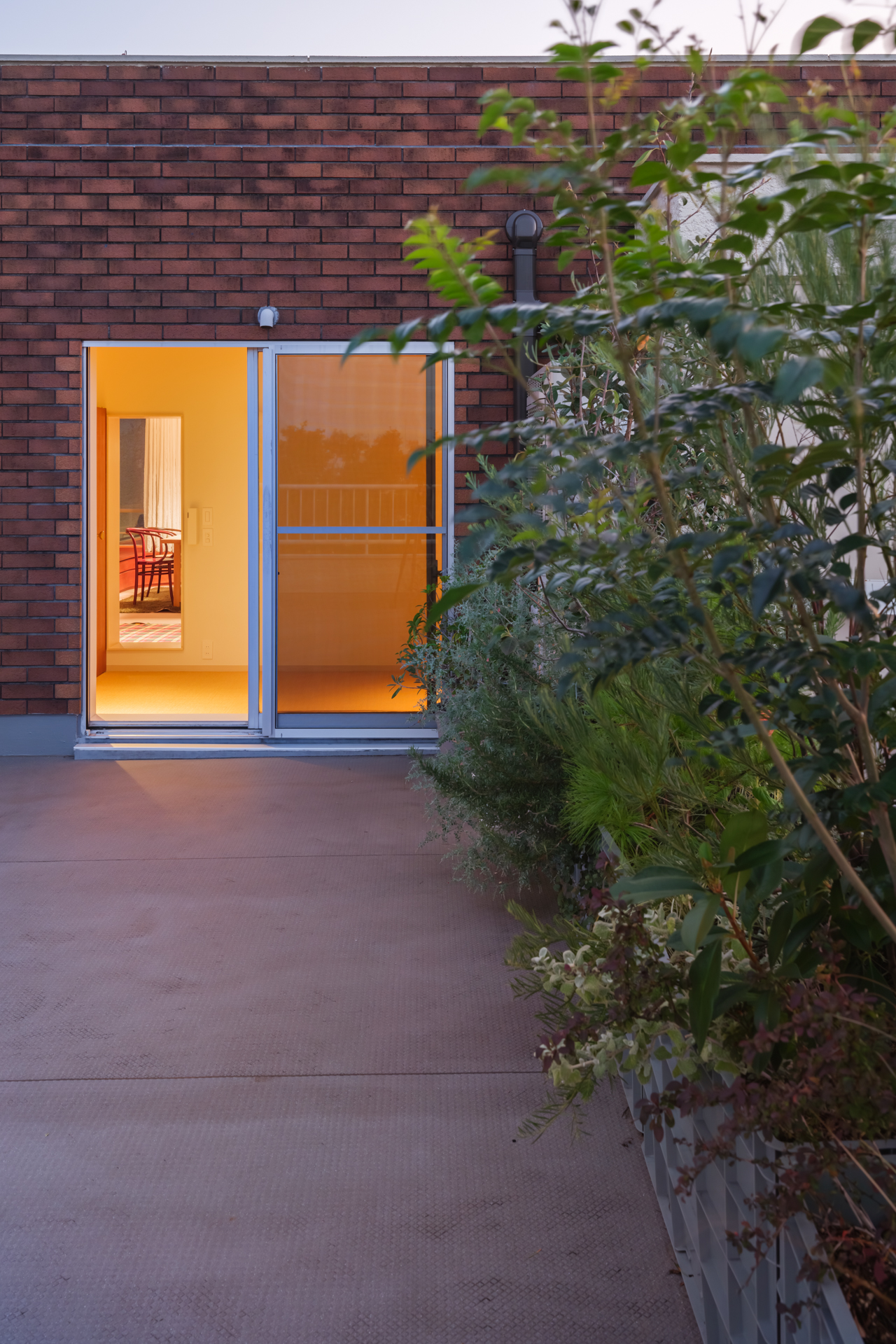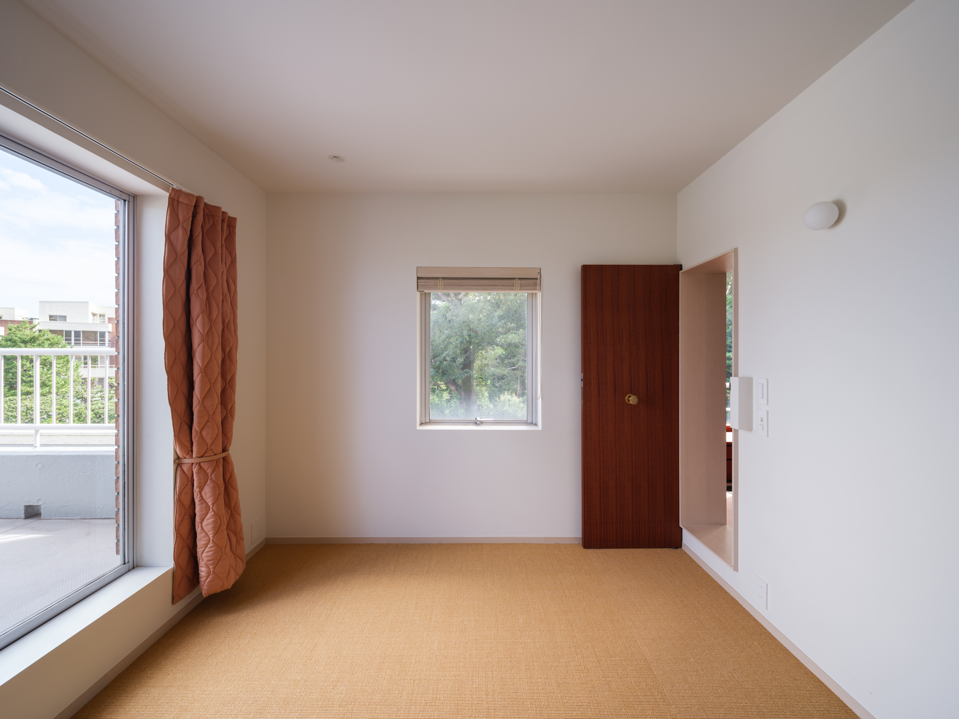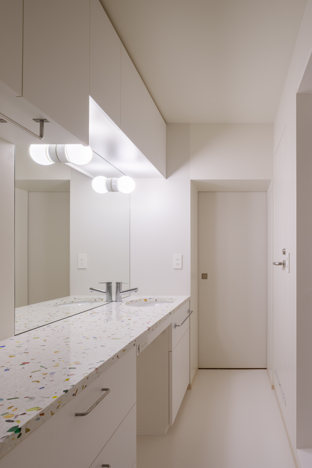 This housing complex, built 50 years ago, takes advantage of natural undulations and preserves a rare 800-tsubo (approx. 1,000 m2) green spaceat its center. The project is the designersʼ own residence, intended to passthis environment to future generations. Facing the overwhelming greenery,the living room was designed in Junzo Yoshimuraʼs “ Kokonoma ” scale̶ which he noted as “ a comfortable size for humans ” found around the world. Another terrace of the same size was placed outside. Together they form the core, dividing the house into two zones: a family living area and a multipurpose zone with a mini-kitchen and toilet. Materials and colors were carefully researched from the original completion period and the existing building, enabling a restoration and renewal similar to overhauling the original architecture. By designing a neutral space that maximizes architectural appeal while minimizing the infl uence of the our personal tastes, we aimed to design a residence that can be lived in by anyone over time.