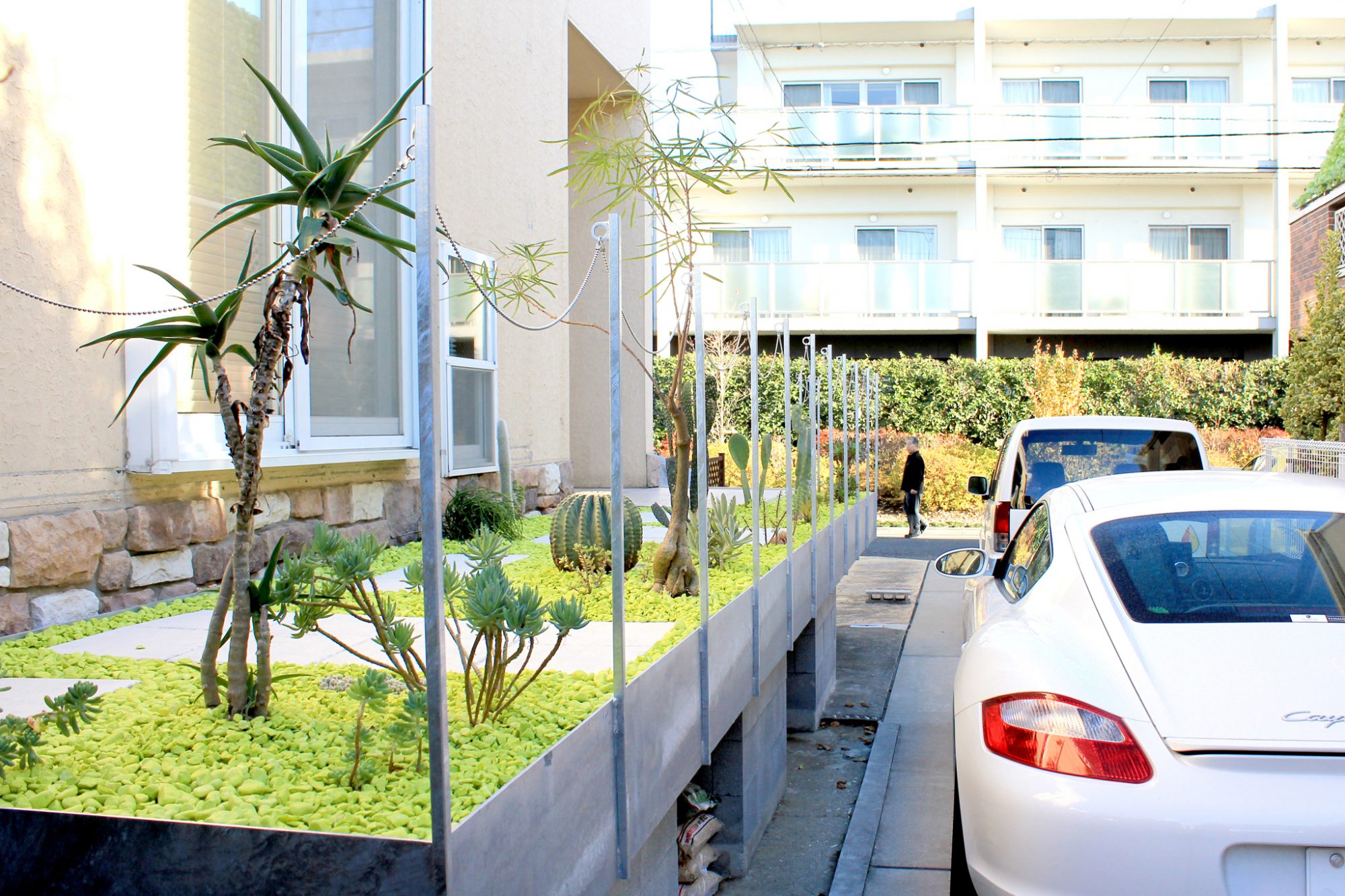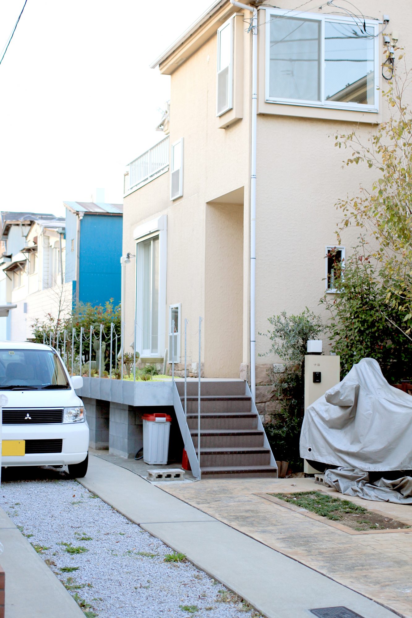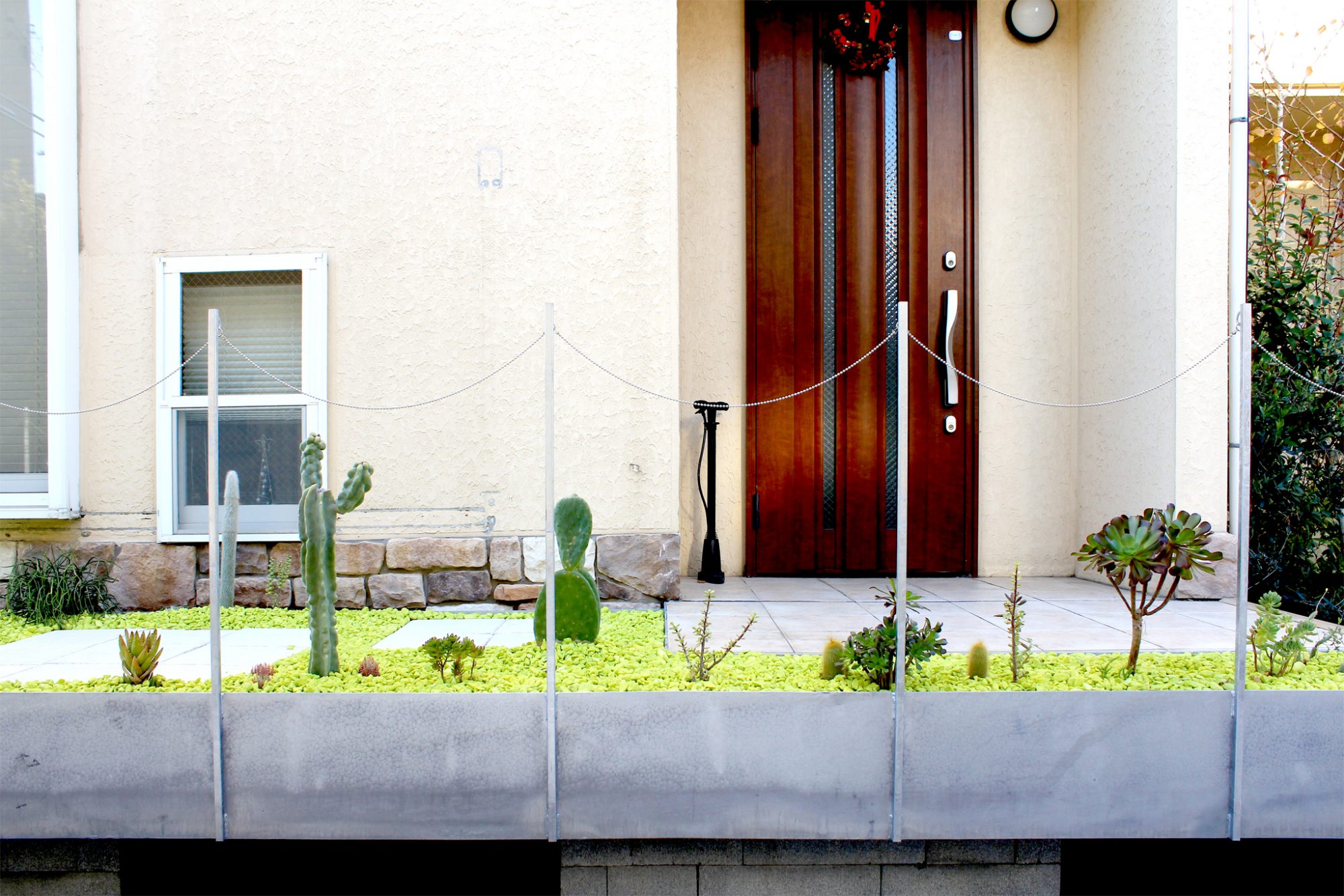 多摩川近くにある築10年あまりの戸建住宅の改修です。改修といえば、床、壁、天井に手を加えることで全く別のものに仕立てる手法が一般化していますが、そうではない改修のあり方があるのでは、と考えました。植物の栄養繁殖の技法に「接ぎ木」という技法があります。植物体の一部分を他の個体に接着し両者を癒合させることで植物の成長を促す技法です。この改修では、建築に建築を「接ぎ木」することで、その見えと価値を改修することを試みました。具体的には、プロヴァンス風住宅という強い個性をもった建物に、別の強い個性をもったプランターテラスとプランター庇を「接ぎ木」しています。そうすることで、これまで一見キッチュに見えていた建物をまったく別の見えと価値をもったものにしています。建物に合わせる植物として、サボテンをメインとした多肉植物を選びました。そして芝生のように見える緑色の石を敷きました。このテラスは、家の出入りの際にいつも目に入ります。そして、家族が集まるリビングの窓から見える風景もまた、植物たちによって改修されています。