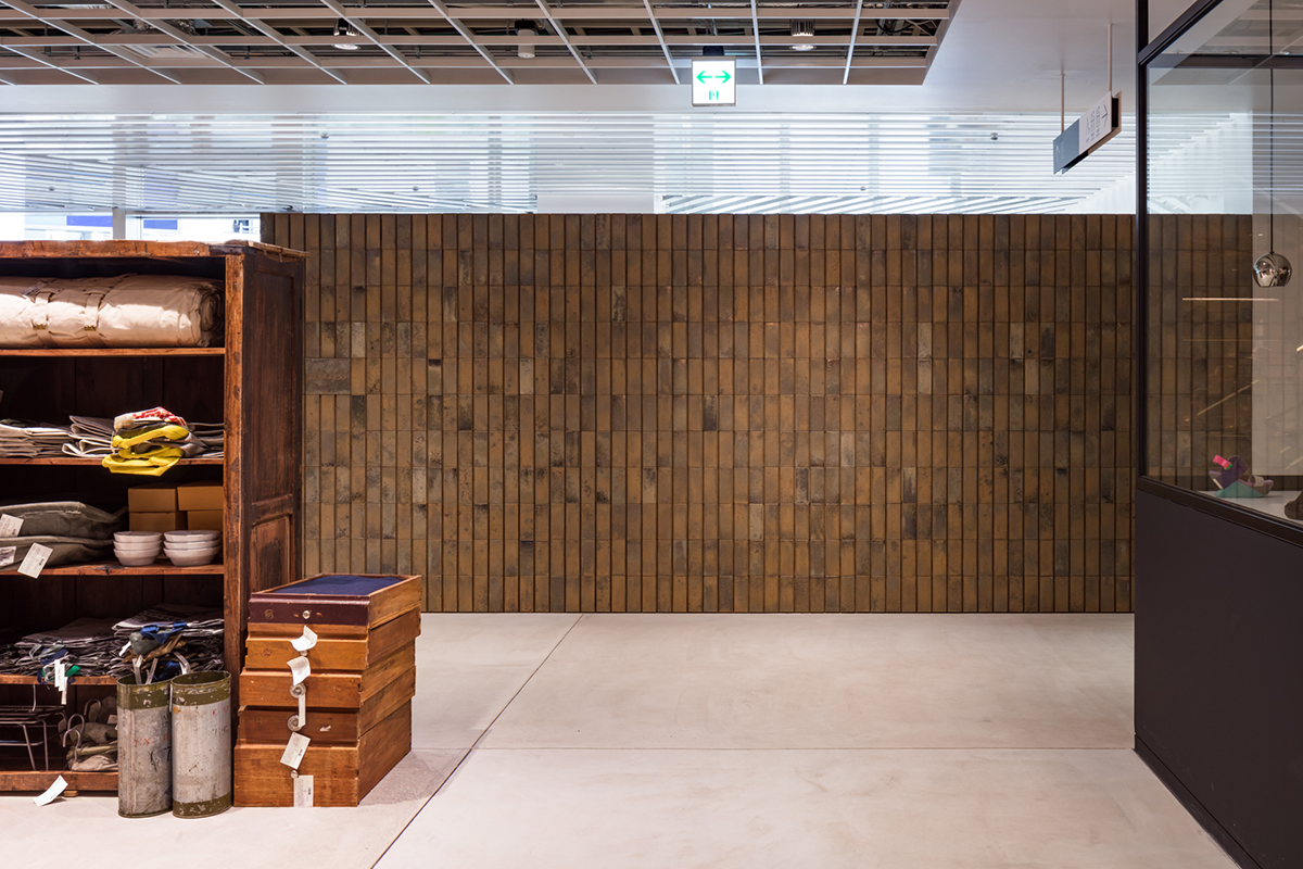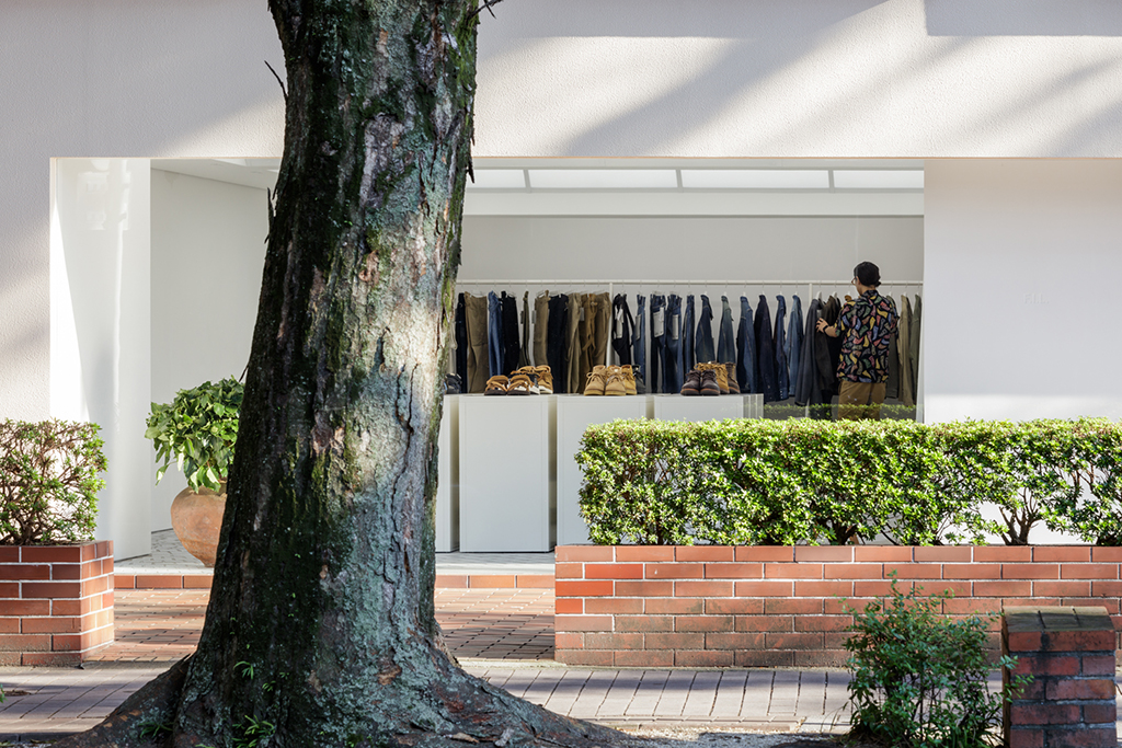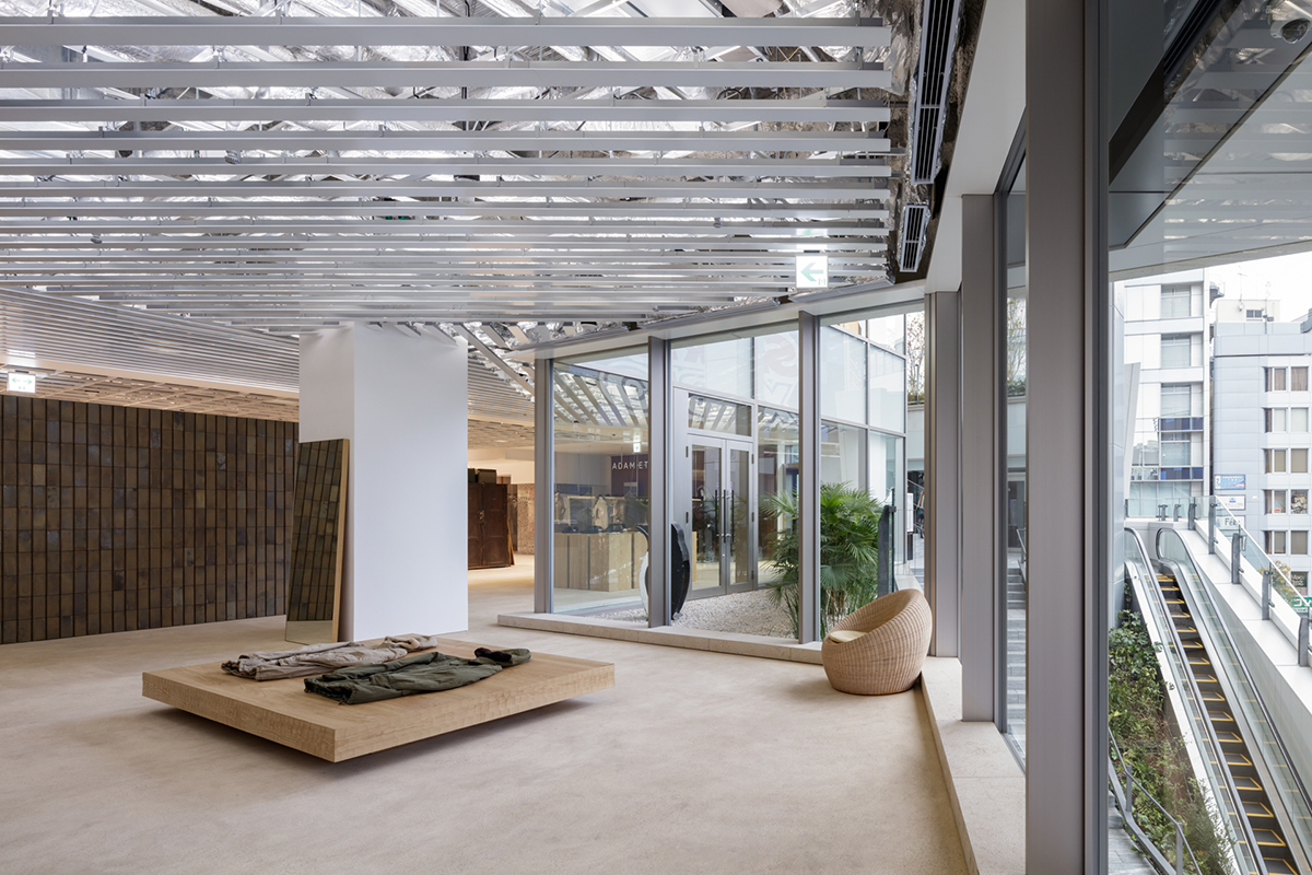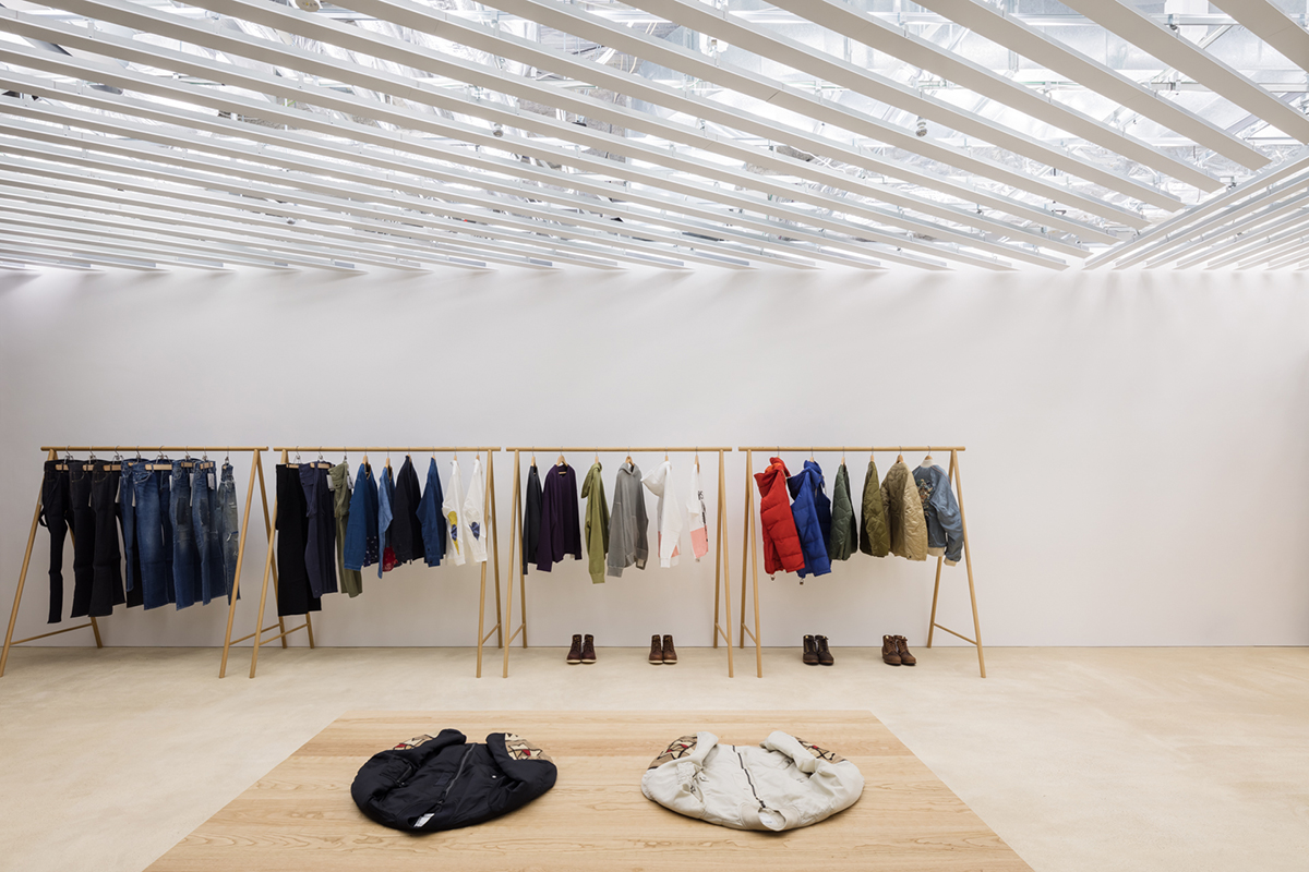 The shop design for the flagship store of the Japanese fashion brand “visvim” in Shibuya PARCO. One of the important conditions for this space is natural light, even if it’s located within the context of a commercial building. Here, we decided to create the earthen floor with full of natural light, for getting the feeling of wilderness. Lighting is installed above the louvered ceiling to offer a soft indirect light reflected inside the ceiling technical space. In the daytime, light from the ceiling and the window are blended, creating a natural and comfortable environment. Lighting is modulated automatically according to the amount of natural light from the window, changing the light environment from the daytime to night smoothly. The floor is treated by Tataki style concrete, and the deadstock bricks used for walls are re-baked by using unevenly grilled finishes, creating a wet expression against a dry, coarse texture. The furniture has the same shape as in the other flagship store, but material is changed into oak treated by Naguri technique. Although each design and materials has a somewhat modest impression compared to the surrounding shopping area, the space helps to create a timeless atmosphere fitting to show expressive products.