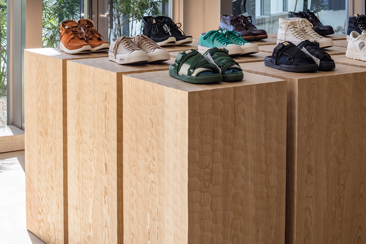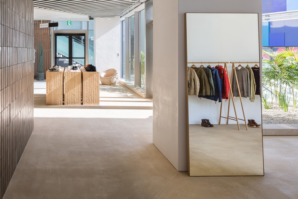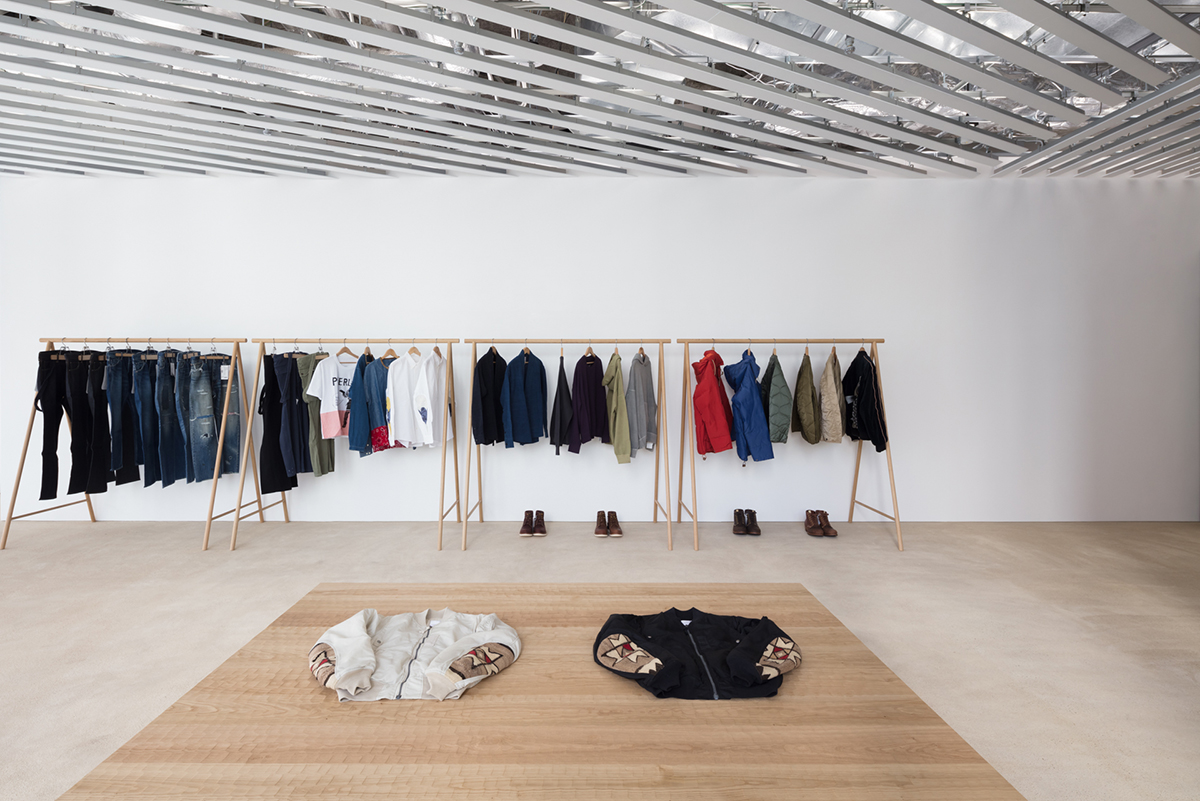 The shop design for the flagship store of the Japanese fashion brand “visvim” in Shibuya PARCO. One of the important conditions for this space is natural light, even if it’s located within the context of a commercial building. Here, we decided to create the earthen floor with full of natural light, for getting the feeling of wilderness. Lighting is installed above the louvered ceiling to offer a soft indirect light reflected inside the ceiling technical space. In the daytime, light from the ceiling and the window are blended, creating a natural and comfortable environment. Lighting is modulated automatically according to the amount of natural light from the window, changing the light environment from the daytime to night smoothly. The floor is treated by Tataki style concrete, and the deadstock bricks used for walls are re-baked by using unevenly grilled finishes, creating a wet expression against a dry, coarse texture. The furniture has the same shape as in the other flagship store, but material is changed into oak treated by Naguri technique. Although each design and materials has a somewhat modest impression compared to the surrounding shopping area, the space helps to create a timeless atmosphere fitting to show expressive products.