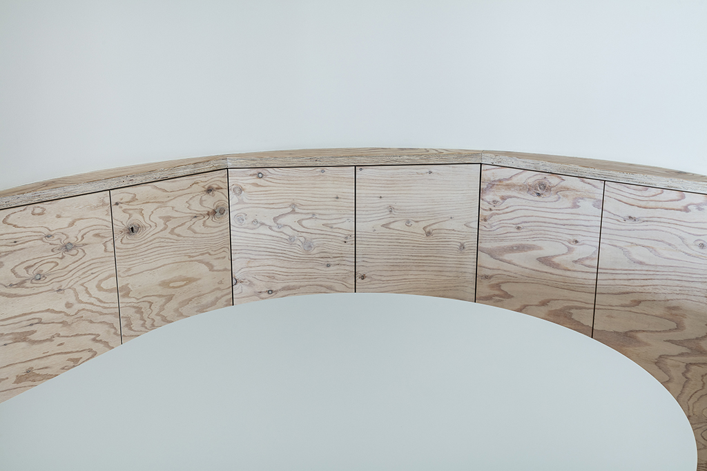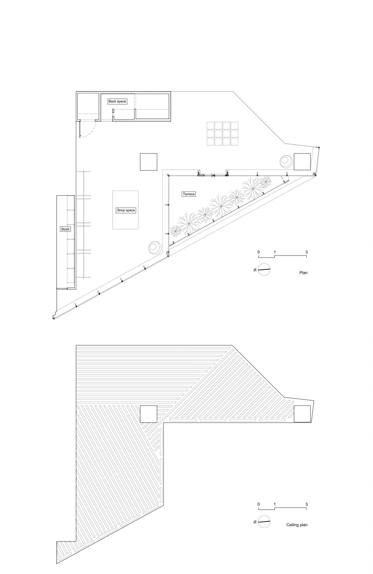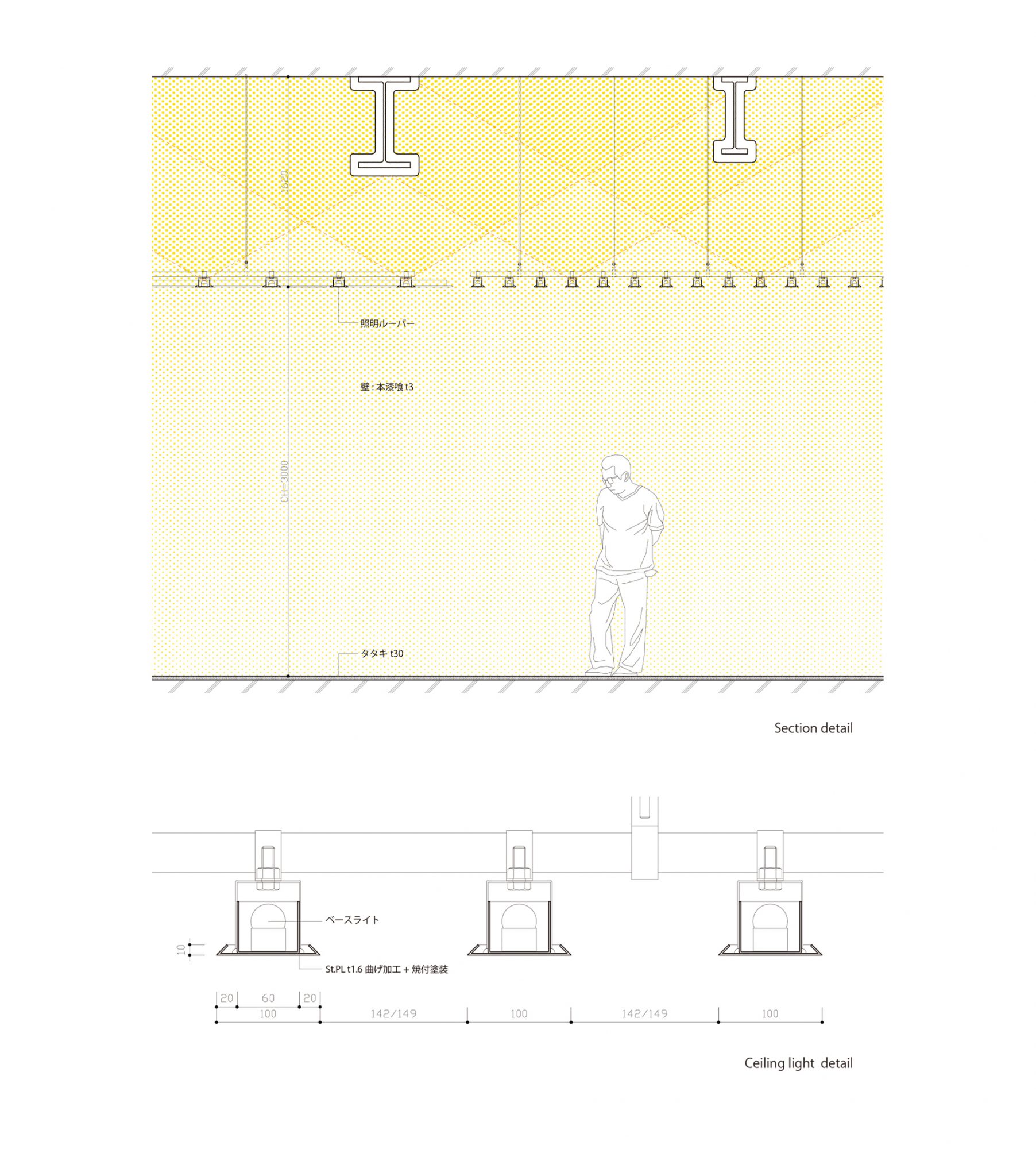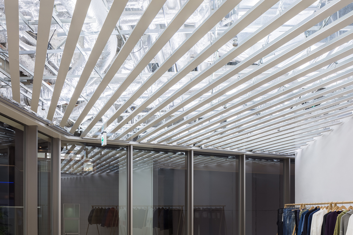 This ceiling creates not only the space both above and below this, but also works as structural and environmental element, which make it possible to remove the existing bracing and to let the wind in from the upper part of the window.