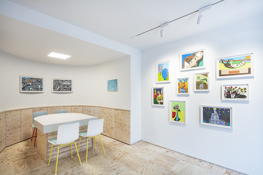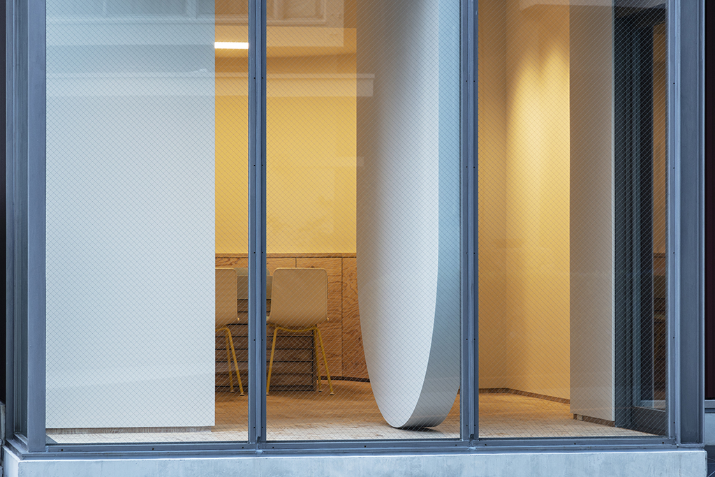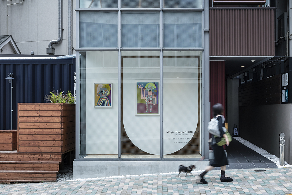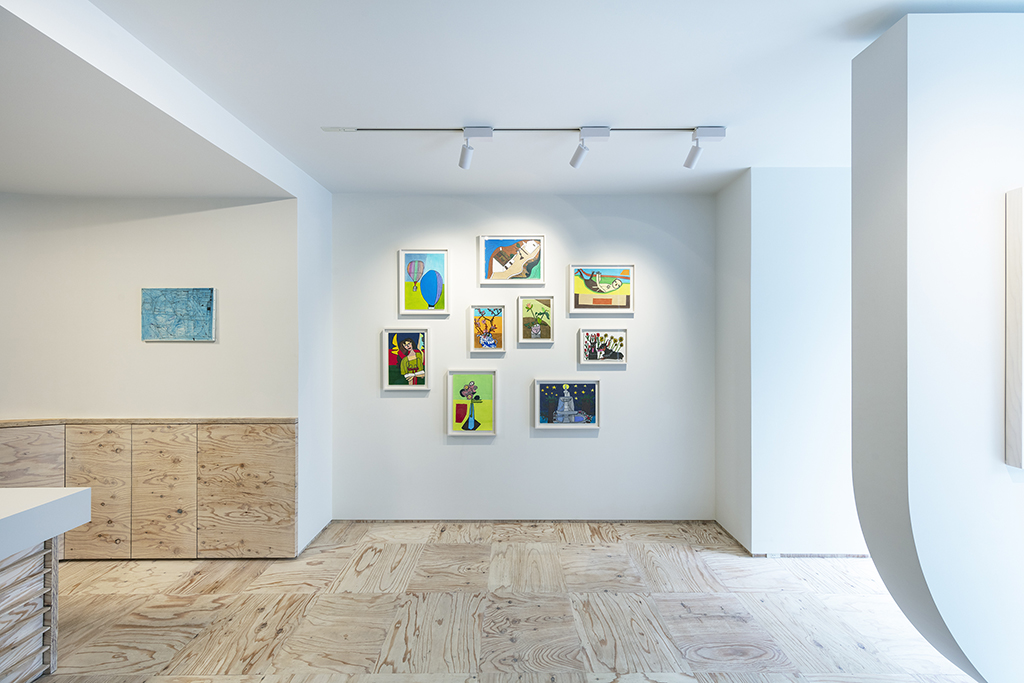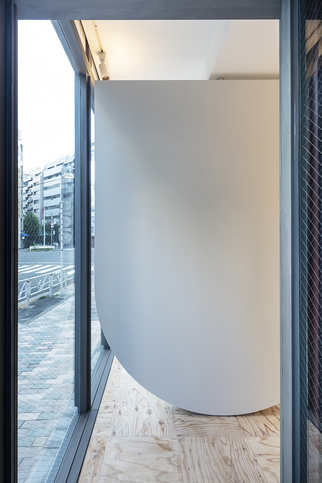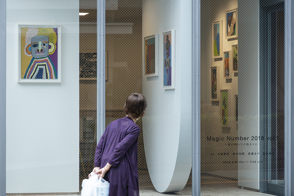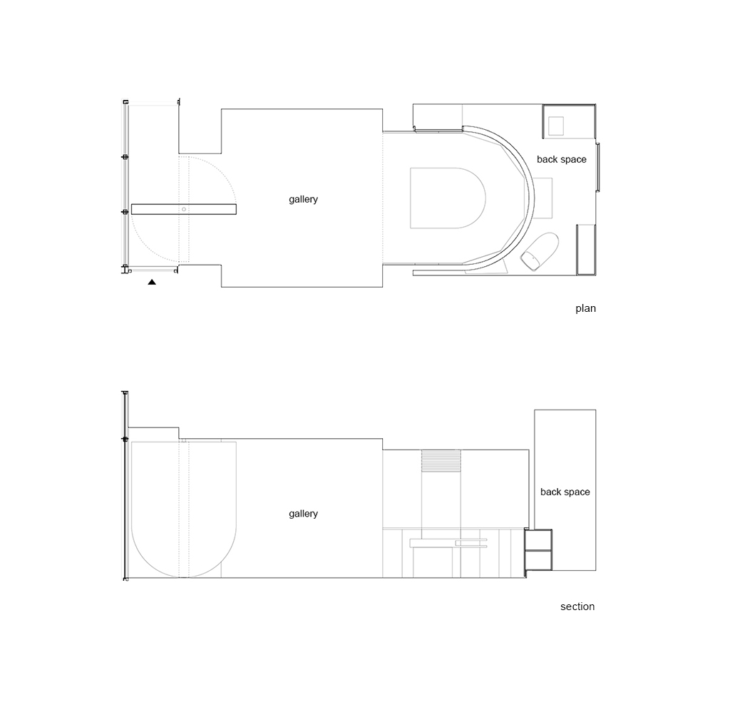 アウトサイダー・アートを扱うコマーシャルギャラリーの内装設計である。オーナーは、美術界だけでなく、日頃美術に所縁のない人たちでも気軽に美術作品を鑑賞し、購入できる、街に開かれたギャラリーにしたいと考えていた。 ギャラリーは、恵比寿西の五叉路に面するビルの1階という好立地にある。街の中で一際目立つアイコンとして、ファサードにU字型の回転扉を設けた。閉廊しているときには扉は閉まることで、ショーウィンドウのようなスペースをつくり、夜間でもそこに飾られた作品が街を彩る。開廊すると、扉は90度回ることでギャラリーと街とを繋ぐ。その扉は、小さなギャラリーにシークエンスを生み出し、空間に奥行きをつくる。 ギャラリー奥にはU字扉と相似型のテーブルがあり、事務・商談スペースになっている。テーブル下のマップケースに収蔵された作品をテーブルの上に並べて、お客さんと一緒に作品を選ぶ。テーブル形状に沿ったアール壁は、ついつい長居してしまうような居心地のよい空間をつくっている。