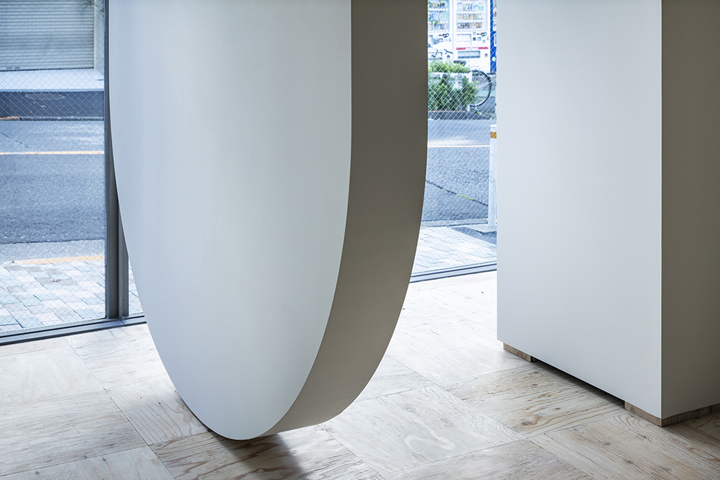 The interior design of the commercial gallery that specializes in the outsider art, which is built in the five-way intersection in Tokyo. The attempt to create a clear symbol in the city and create the interior space with its symbol. The large U-shaped rotating door behind the glass façade divides the space functionally by its opening and closing, and gives the expanse to the small space. The U-shaped table set in the inner space is used not only as the office space and the viewing space but also as the storage case of art works.