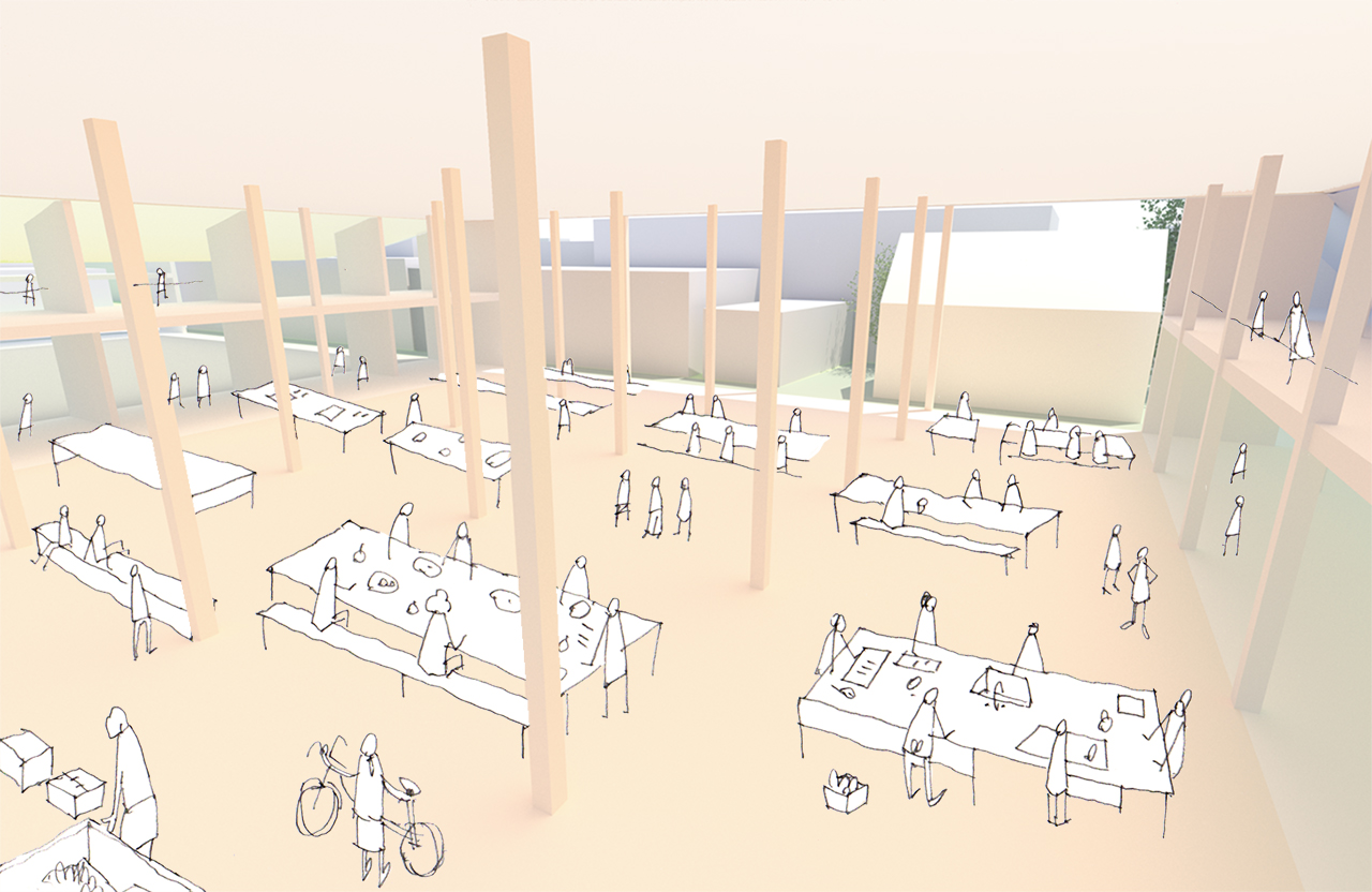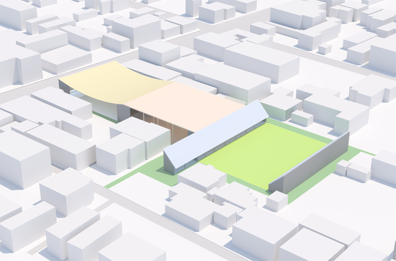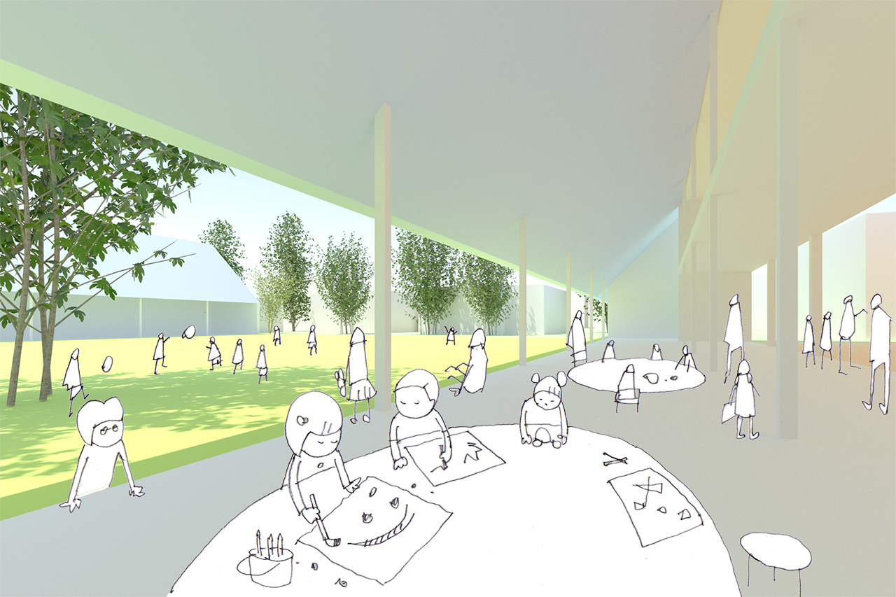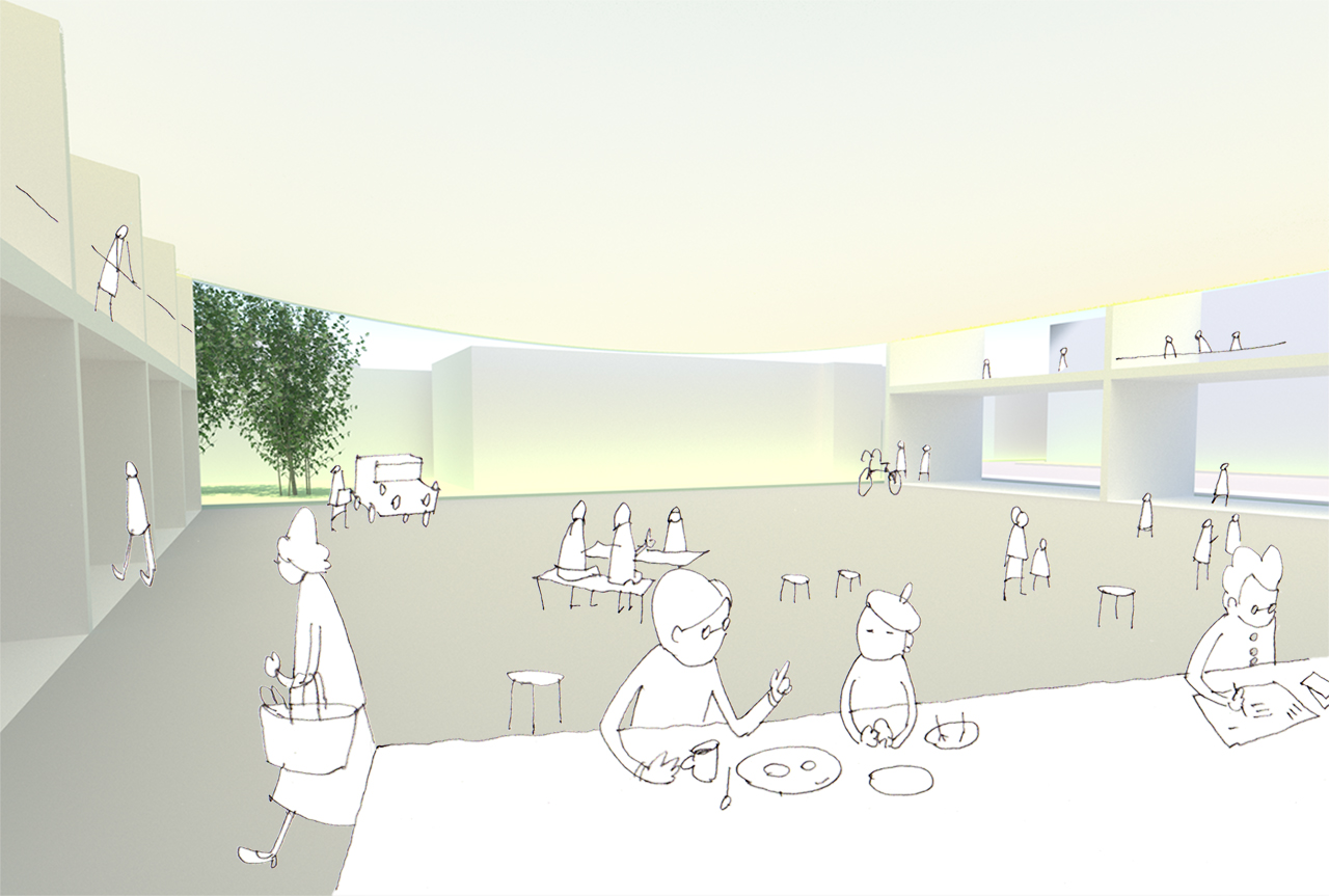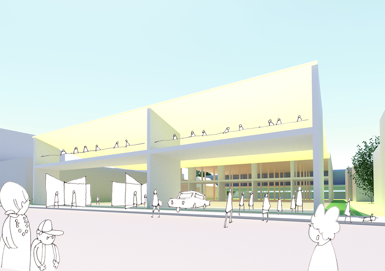 那須塩原市黒磯に提案したまちなか交流センター・まちなか交流広場の計画案である。「人と食を育む まちの学校」をテーマに、3つの広場と小さな部屋が集まった細長い縁側により、誰もがいつでも使える居場所、那須地域の食を中心とした多様な活動の受け皿をめざした。3つの広場はそれぞれ、石の広場(半屋外)、木の広場(屋内)、芝の広場(屋外)とし、各々の独立と連携、縁側空間との接続により、大きな賑わいをつくると同時に、その一角に人が少なく落ち着いた雰囲気の場所をつくることができるようになっている。