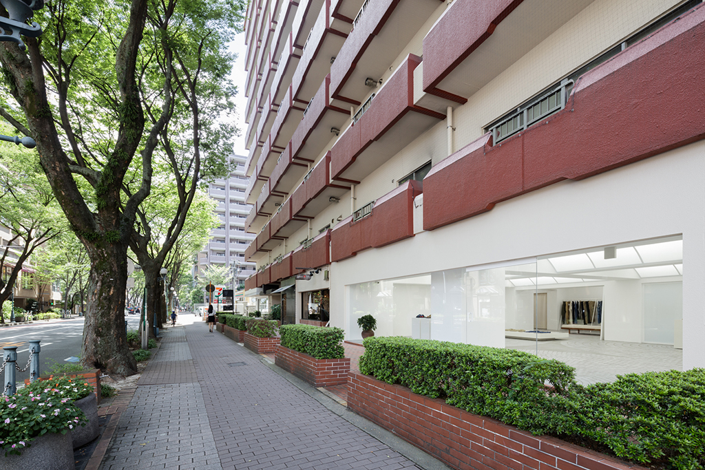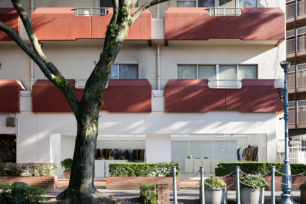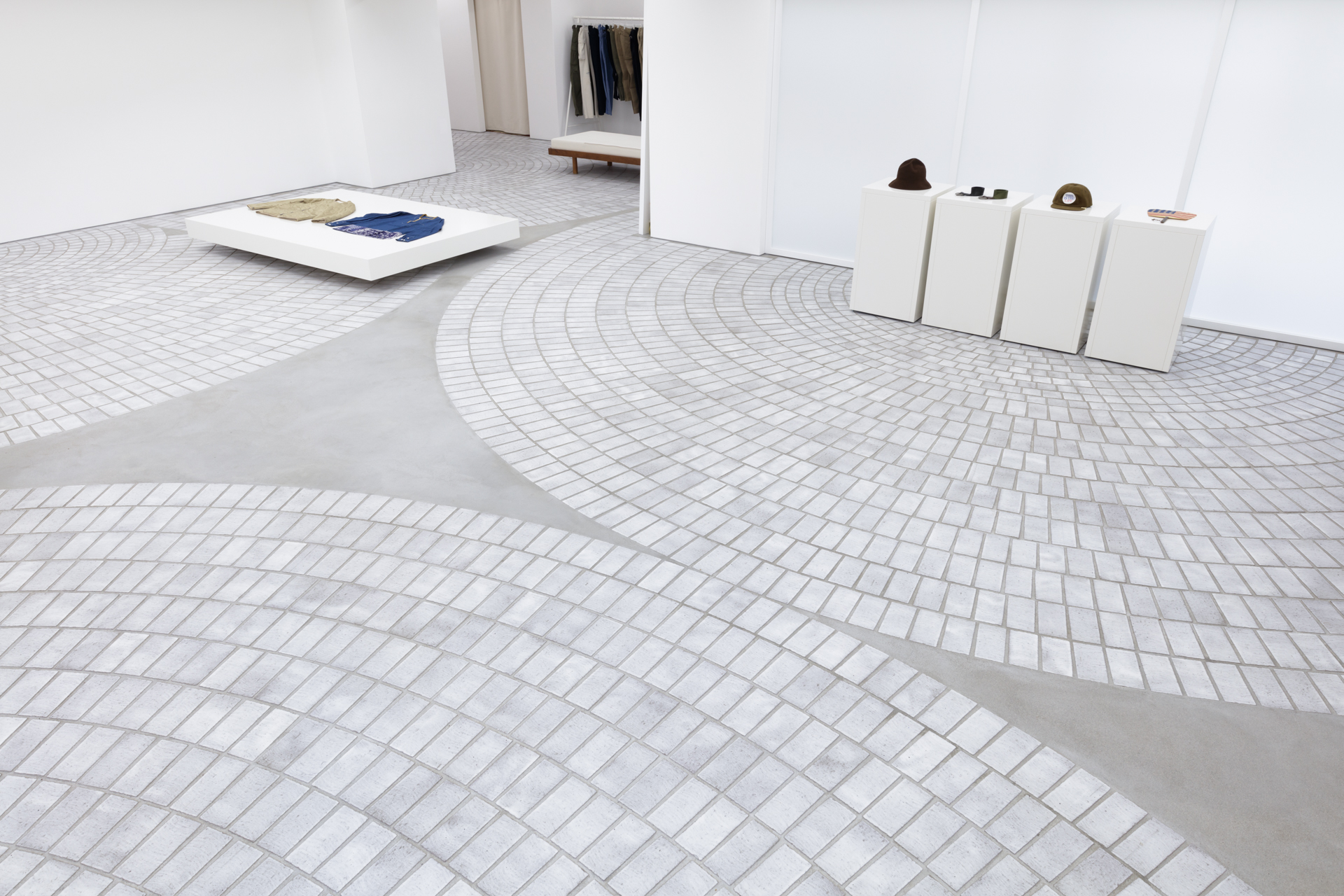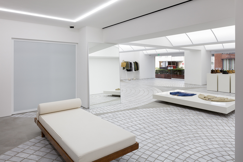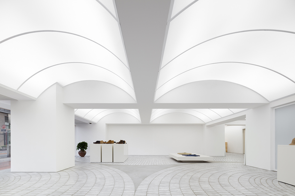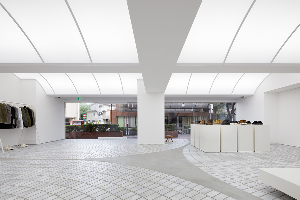 The shop design for the flagship store of the Japanese fashion brand “visvim.” The shop is facing the serene street, with a hundred planted Zelkova trees and brick pavement. Vintage apartments standing along this street match the calm cityscape and nearby, there is the museum designed by Kunio Mayekawa, which has elegant vaulted ceiling and brick-cladding. Here, we tried to bring such an atmosphere of the surroundings into even an interior of the shop. The vaulted light ceiling is designed to make use of the many structural beams, offering light without any shade. On the floor, a ripple-like pattern of white brick, which is made originally by applying a white glaze prior to re-baking, creates a rhythm from the entrance towards deeper inside. The quality of this realized interior space is like a courtyard of a sculpture museum, and footwear and garments are exhibited in this softly lit environment.